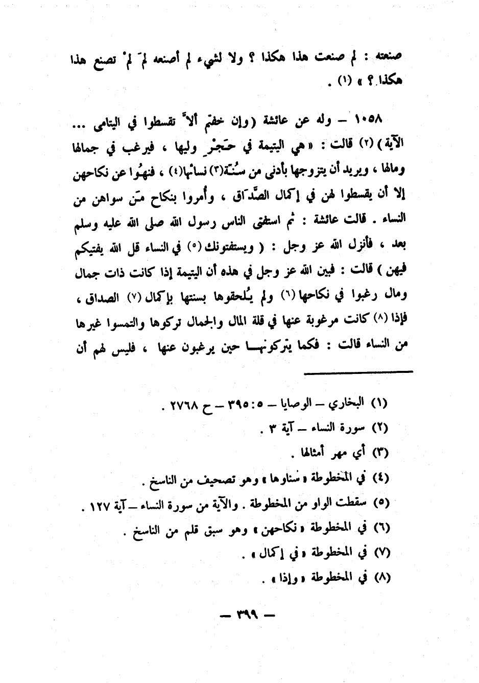 1058- وله عن عائشة: {وَإِنْ خِفْتُمْ أَلَّا تُقْسِطُوا فِي الْيَتَامَى} 2 الآية قالت: "هي اليتيمة في حَجْرِ وليها، فيرغب في جمالها ومالها، ويريد أن يتزوجها بأدنى من سُنَّة3 نسائها، 4 فنُهُوا عن نكاحهن إلا أن يقسطوا لهن في إكمال الصَّداق، وأُمروا بنكاح مَن سواهن من النساء. قالت عائشة: ثم استفتى الناس رسول الله صلى الله عليه وسلم بعد، فأنزل الله عز وجل: {وَيَسْتَفْتُونَكَ5 فِي النِّسَاءِ قُلِ اللَّهُ يُفْتِيكُمْ فِيهِنَّ} قالت: فبين الله عز وجل في هذه أن اليتيمة إذا كانت ذات جمال ومال رغبوا في نكاحها6 ولم يُلحقوها بسنتها بإكمال7 الصداق، فإذا8 كانت مرغوبة عنها في قلة المال والجمال تركوها والتمسوا غيرها من النساء، قالت: فكما يتركونها حين يرغبون عنها فليس لهم أن