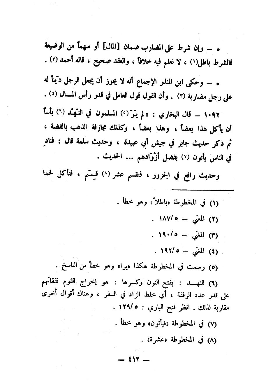 1092- قال البخاري: " لم يَرَ5 المسلمون في النّهْد6 بأساً أن يأكل هذا بعضاً، وهذا بعضاً، وكذلك مجازفة الذهب بالفضة" ثم ذكر حديث جابر في جيش أبي عبيدة، وحديث سلمة قال: "فنادِ في الناس يأتون7 بفضل أزْوادهم ... " الحديث.