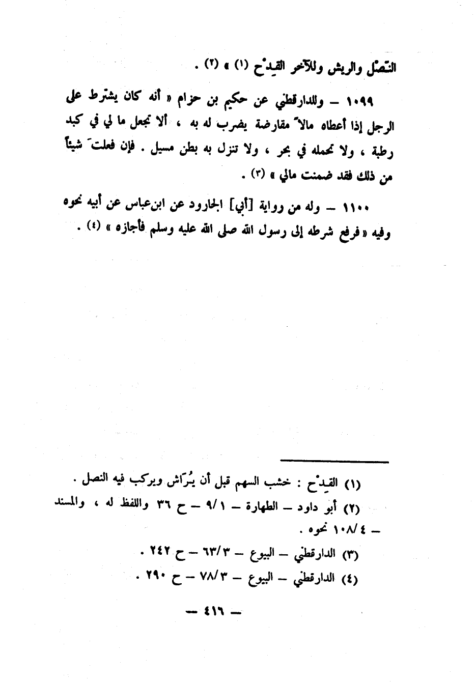 1099- وللدارقطني عن حكيم بن حزام: (أنه كان يشترط على الرجل إذا أعطاه مالاً مقارضة يضرب له به، ألا تجعل مالي في كبد رطبة، ولا تحمله في بحر، ولا تنزل به بطن مسيل. فإن فعلتَ شيئاً من ذلك فقد ضمنت مالي"3.