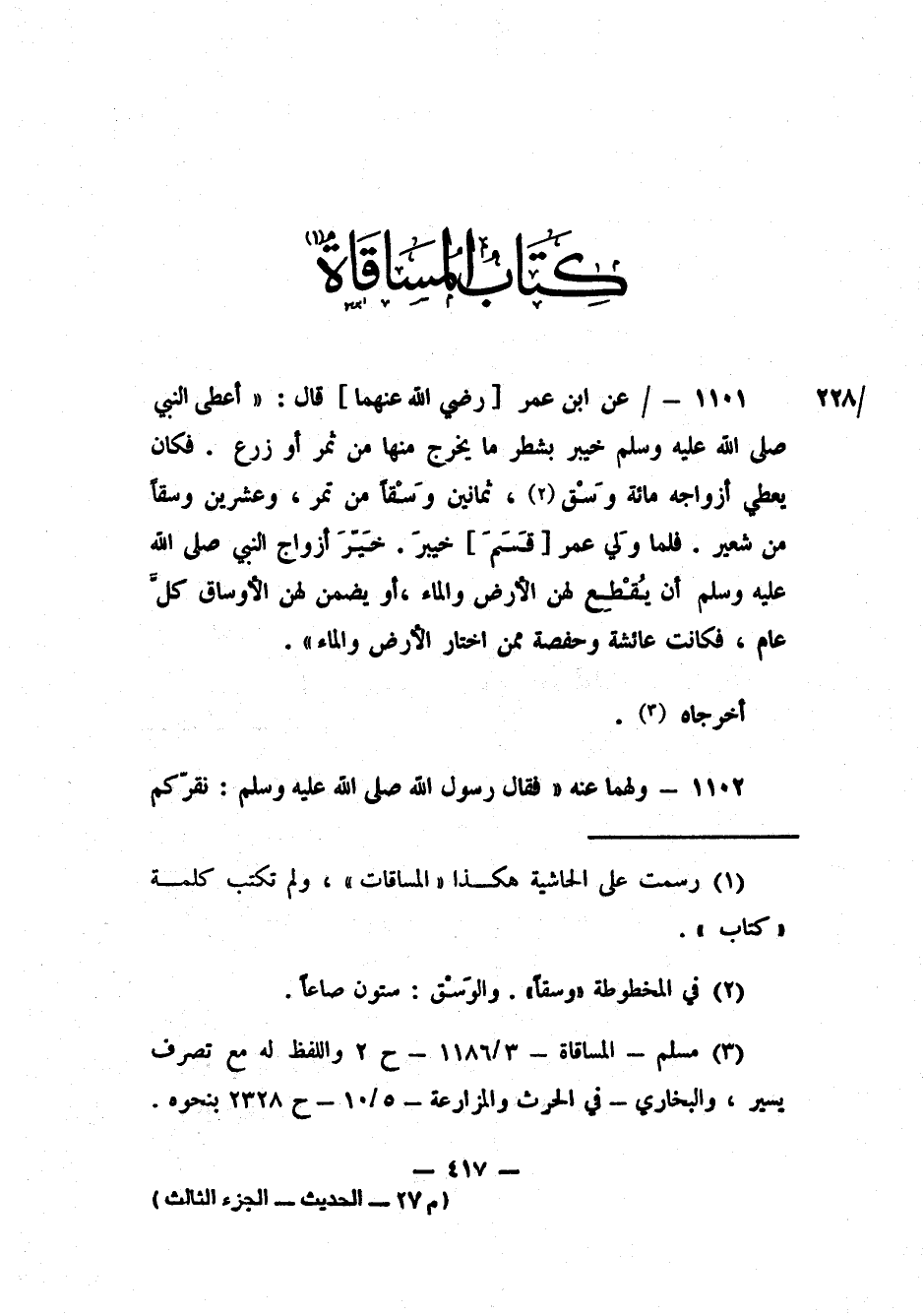 1101- عن ابن عمر [رضي الله عنهما] قال: "أعطى النبي صلى الله عليه وسلم خيبر بشطر ما يخرج منها من ثمر أو زرع. فكان يعطي أزواجه مائة وَسْق2 ثمانين وَسْقا من تمر، وعشرين وسقاً من شعير. فلما وَلي عمر [قَسَمَ] خيبرَ. خيرَّ أزواج النبي صلى الله عليه وسلم أن يُقْطَع لهن الأرض والماء، أو يضمن لهن الأوساق كلَّ عام، فكانت عائشة وحفصة ممن اختار الأرض والماء" أخرجاه3.