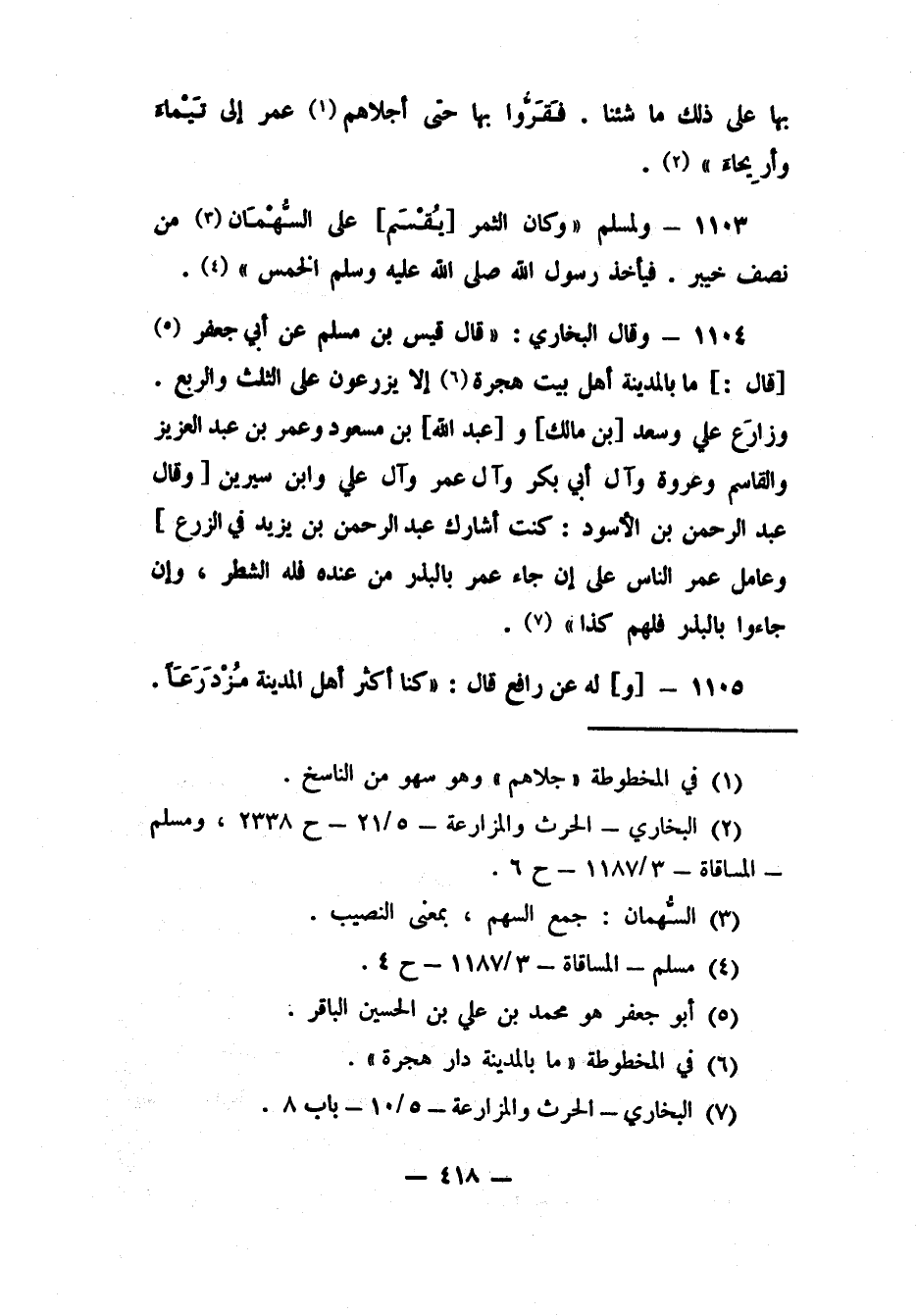 1104- وقال البخاري: " قال قيس بن مسلم عن أبي جعفر5 [قال:] (ما بالمدينة أهل بيت هجرة6 إلا يزرعون على الثلث والربع" "وزارَع علي وسعد [بن مالك] و [عبد الله] بن مسعود وعمر بن عبد العزيز والقاسم وعروة وآل أبي بكر وآل عمر وآل علي وابن سيرين" وقال عبد الرحمن بن الأسود: (كنت أشارك عبد الرحمن بن يزيد في الزرع" "وعامل عمر الناس على إن جاء عمر بالبذر من عنده فله الشطر، وإن جاءووا بالبذر فلهم كذا"7.