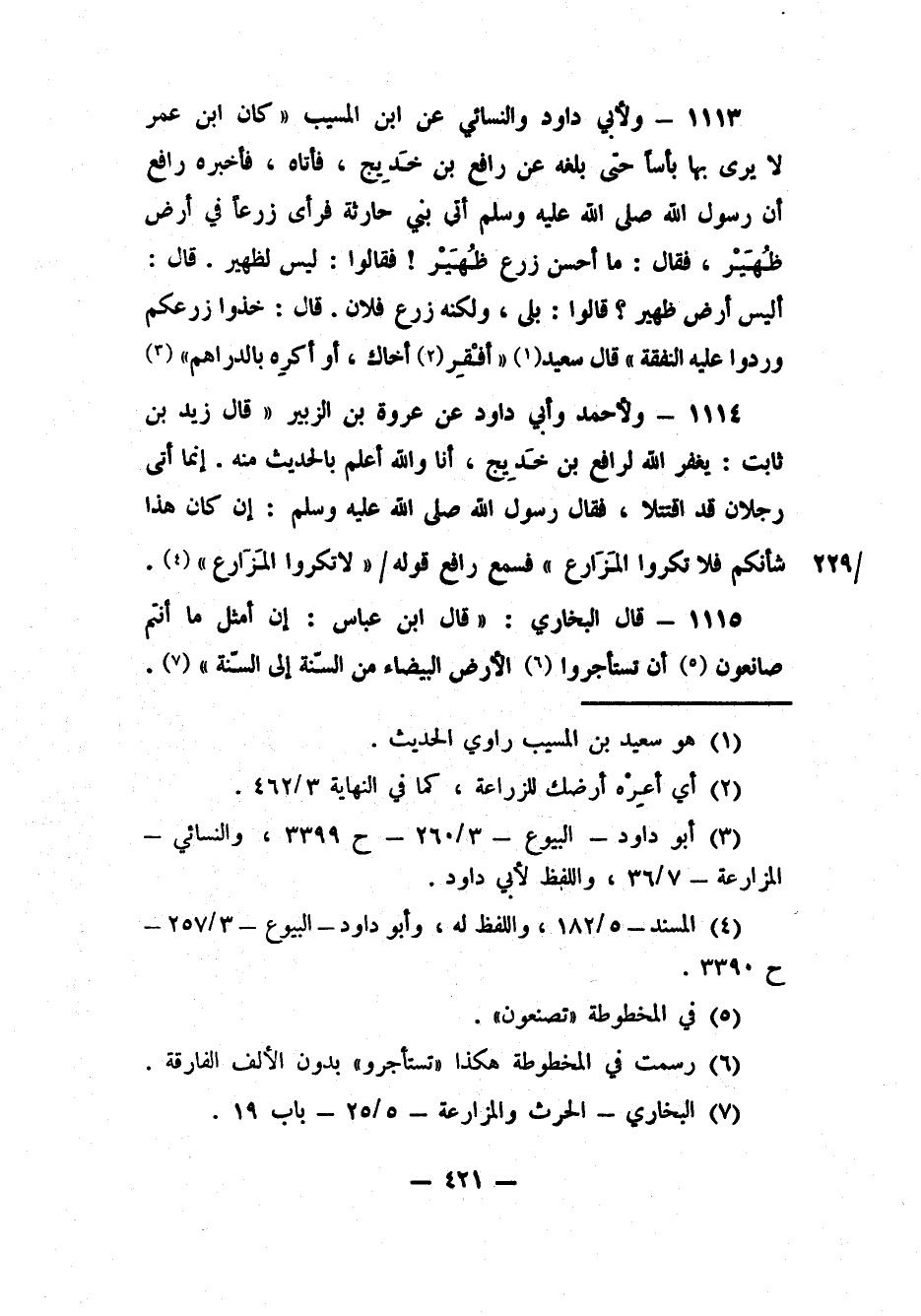 1113- ولأبي داود والنسائي عن ابن المسيب: "كان ابن عمر لا يرى بها بأساً حتى بلغه عن رافع بن خَديج فأتاه، فأخبره رافع أن رسول الله صلى الله عليه وسلم أتى بني حارثة فرأى زرعاً في أرض ظُهَيْر، فقال: ما أحسن زرع ظُهَيْر! فقالوا: ليس لظهير. قال: أليس أرض ظهير؟ قالوا: بلى، ولكنه زرع فلان. قال: خذوا زرعكم وردوا عليه النفقة" قال سعيد1 "أفْقِرْ2 أخاك، أو أكرِه بالدراهم" 3.