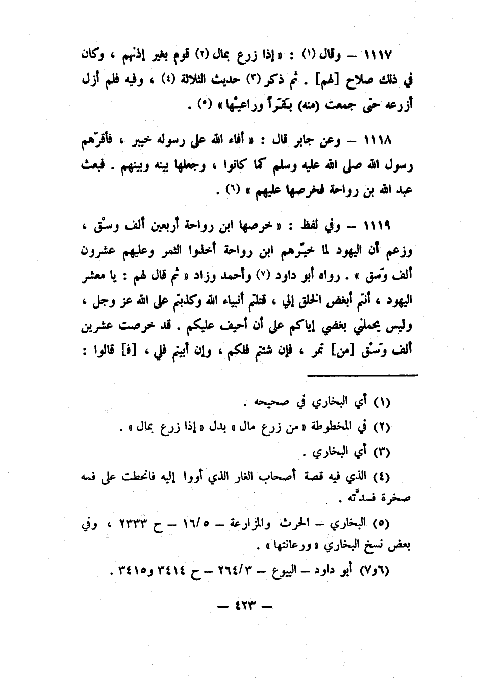 1118- وعن جابر قال: "أفاء الله على رسوله خيبر، فأقرّهم رسول الله صلى الله عليه وسلم كما كانوا، وجعلها بينه وبينهم. فبعث عبد الله بن رواحة فخرصها عليهم"6.