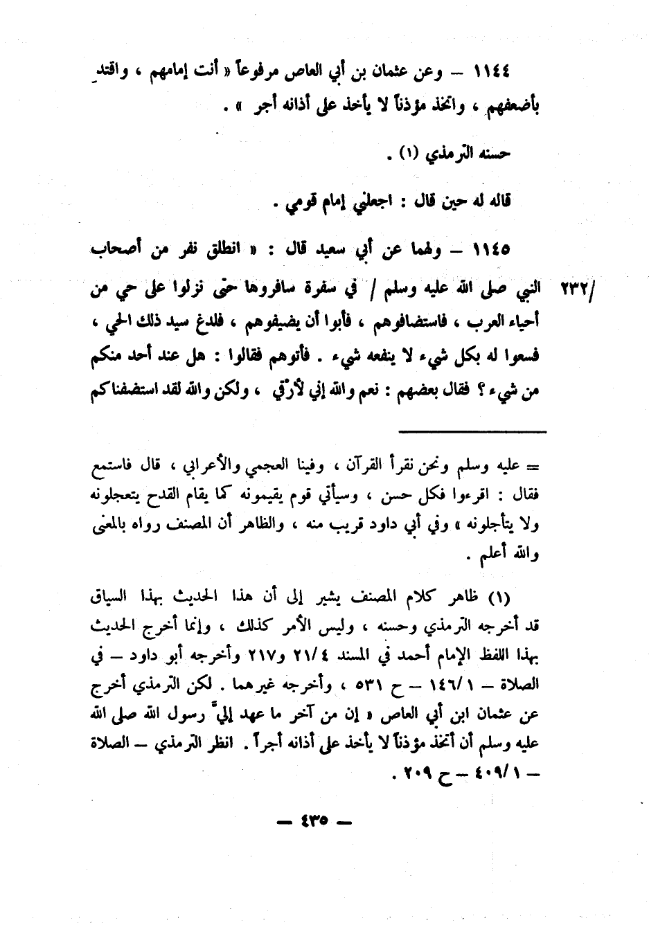1144- وعن عثمان بن أبي العاص مرفوعاً: "أنت إمامهم، واقْتَدِ بأضعفهم، واتخذ مؤذناً لا يأخذ على أذانه أجرا" حسنه الترمذي1.قال له حين قال: اجعلني إمام قومي.