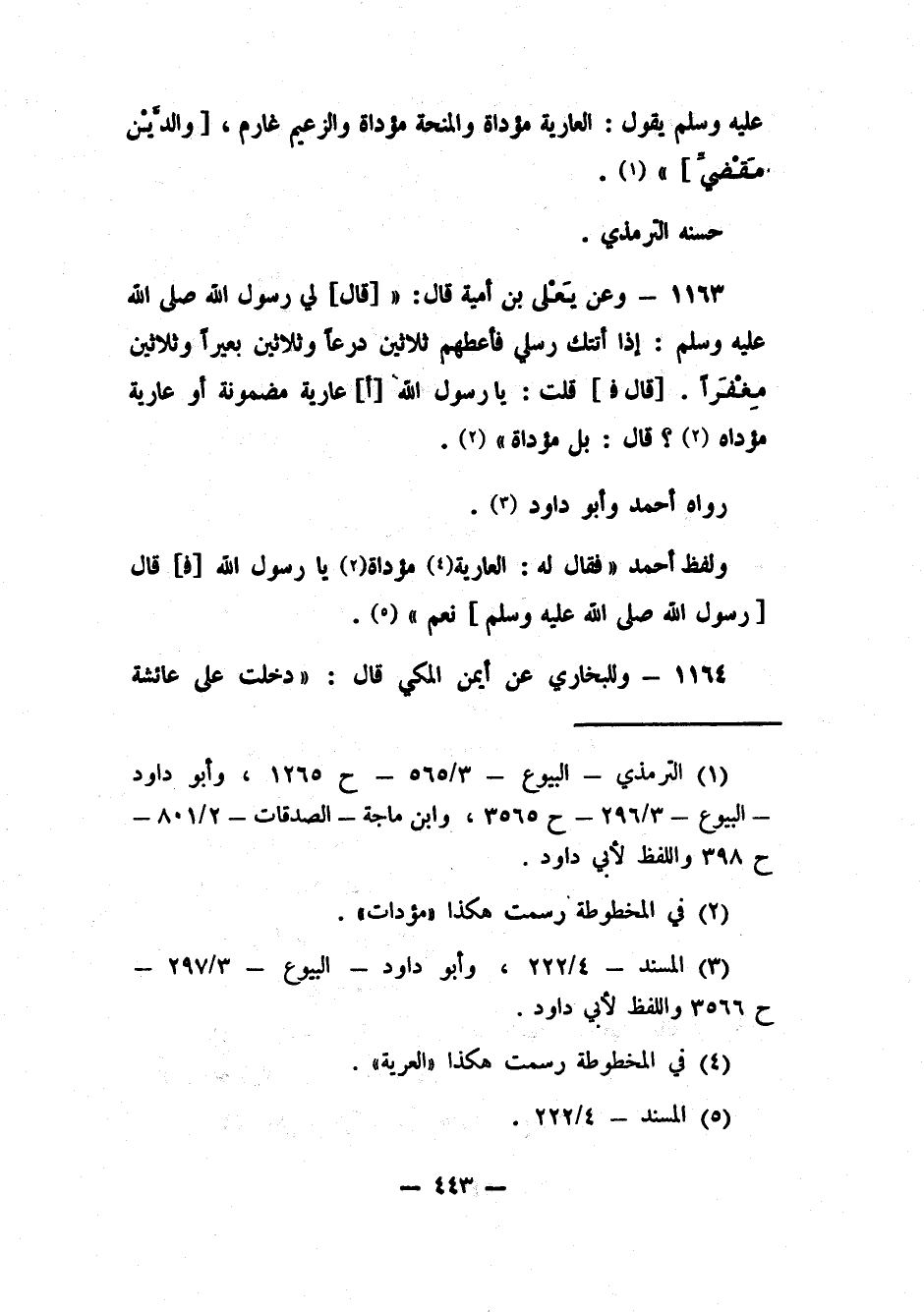 1163- وعن يَعْلى بن أمية قال: " [قال] لي رسول الله صلى الله عليه وسلم: "إذا أتتك رسلي فأعطهم ثلاثين درعاً وثلاثين بعيراً وثلاثين مِغْفَراً. [قال فـ] قلت: يا رسول الله [أ] عارية مضمونة أو عارية مؤداة 2؟ قال: بل مؤداة" 3 رواه أحمد وأبو داود4.