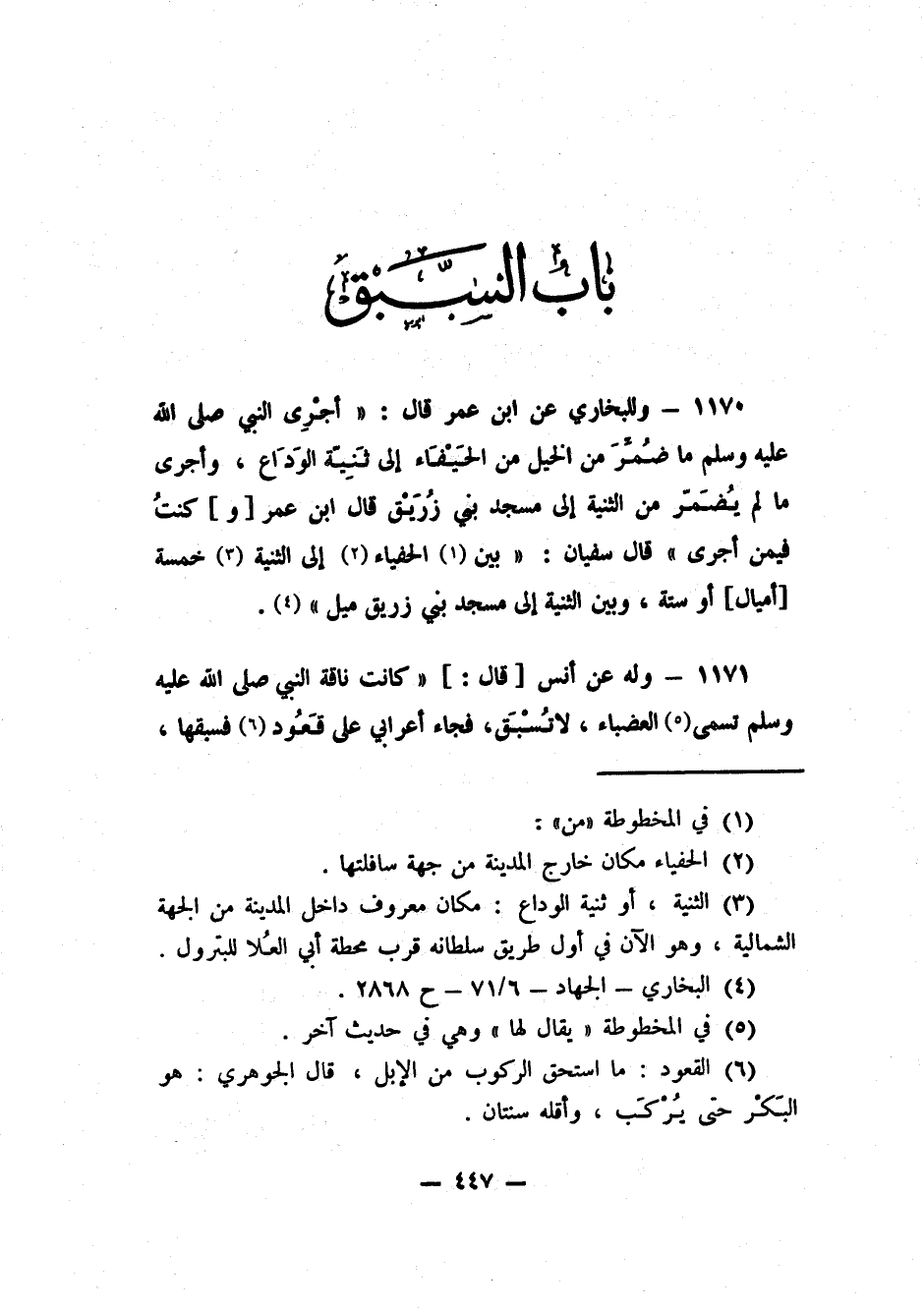 1170- وللبخاري عن ابن عمر قال: "أجْرِي النبي صلى الله عليه وسلم ما ضُمِّرَ من الخيل من الْحَفْيَاء إلى ثَنِيّة الوَدَاع، وأجرى ما لم يُضَمّر من الثنية إلى مسجد بني زُرَيق. قال ابن عمر [و] كنتُ فيمن أجرى". قال سفيان: "بين1 الحفياء2 إلى الثنية3 خمسة [أميال] أو ستة، وبين الثنية إلى مسجد بني زريق ميل"4.