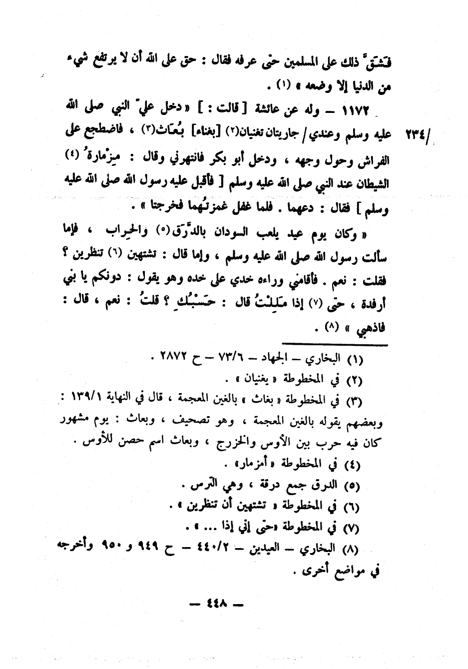 1172- وله عن عائشة [قالت:] "دخل علي النبي صلى الله عليه وسلم وعندي جاريتان تغنيان2 [بغناء] بُعاث3، فاضطجع على الفراش وحول وجهه، ودخل أبو بكر فانتهرني وقال: مزمارةُ4 الشيطان عند النبي صلى الله عليه وسلم. [فأقبل عليه رسول الله صلى الله عليه وسلم] فقال: دعهما. فلما غفل غمزتُهما فخرجتا" "وكان يوم عيد يلعب السودان بالدَّرَقِ5 والحراب، فإما سألت رسول الله صلى الله عليه وسلم وإما قال: تشتهين 6 تنظرين؟ فقلت: نعم. فأقامني وراءه، خدي على خده وهو يقول: دونكم يا بني أرفده، حتى 7 إذا مَلِلْتُ قال: حَسْبُكِ؟ قلتُ: نعم، قال: فاذهبي" 8.