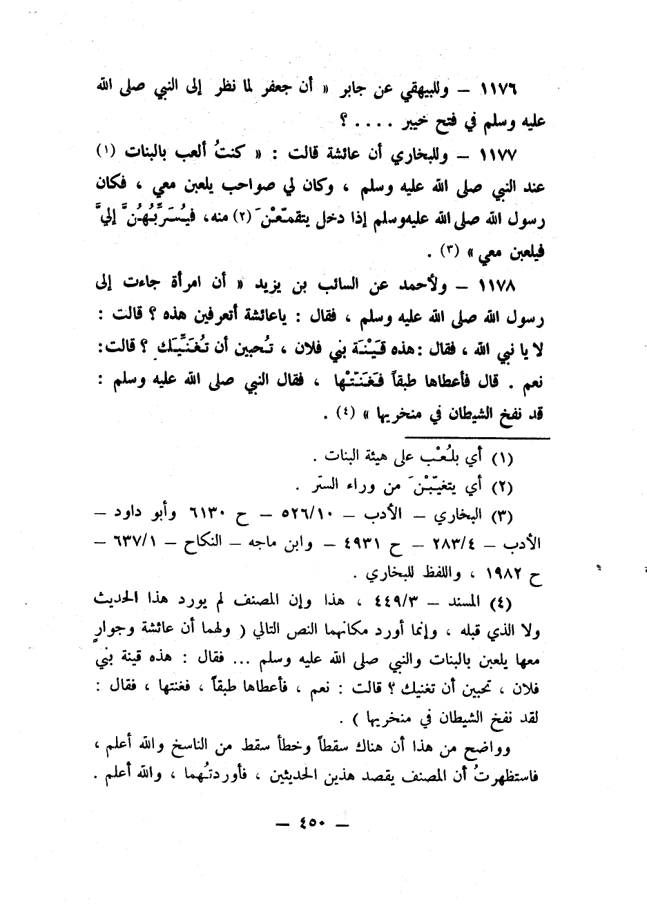 1178- ولأحمد عن السائب بن يزيد: "أن امرأة جاءت إلى رسول الله صلى الله عليه وسلم فقال: يا عائشة أتعرفين هذه؟ قالت: لا يا نبي الله، فقال: هذه قَيْنَةُ بني فلان، تُحبين أن تُغَنِّيكِ؟ قالت: نعم. قال فأعطاها طبقاً فَغَنَّتْهَا، فقال النبي صلى الله عليه وسلم قد نفخ الشيطان في منخريها" 4.