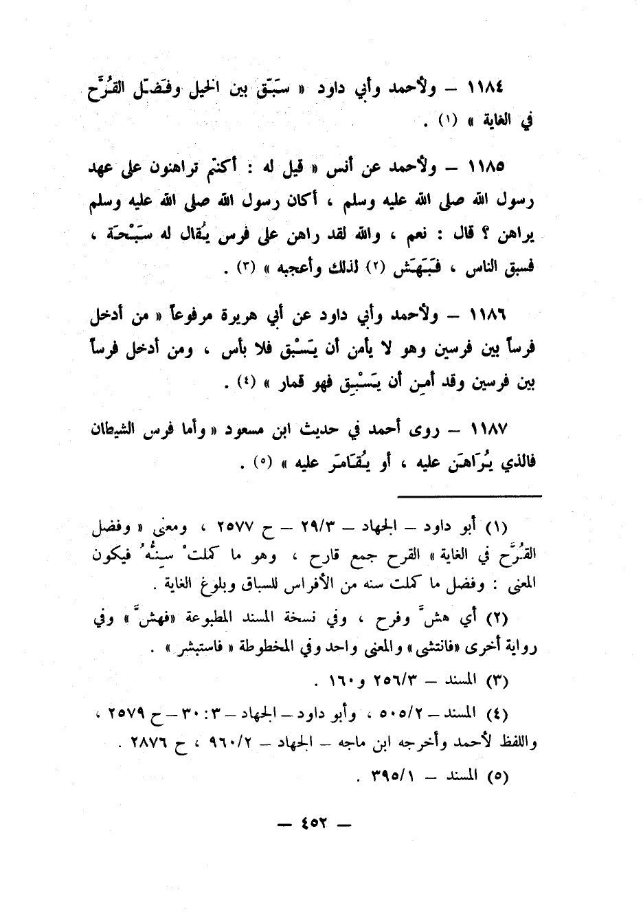 1187- روى أحمد في حديث ابن مسعود: "وأما فرس الشيطان فالذي يُرَاهَن عليه، أو يُقَامَر عليه"5.