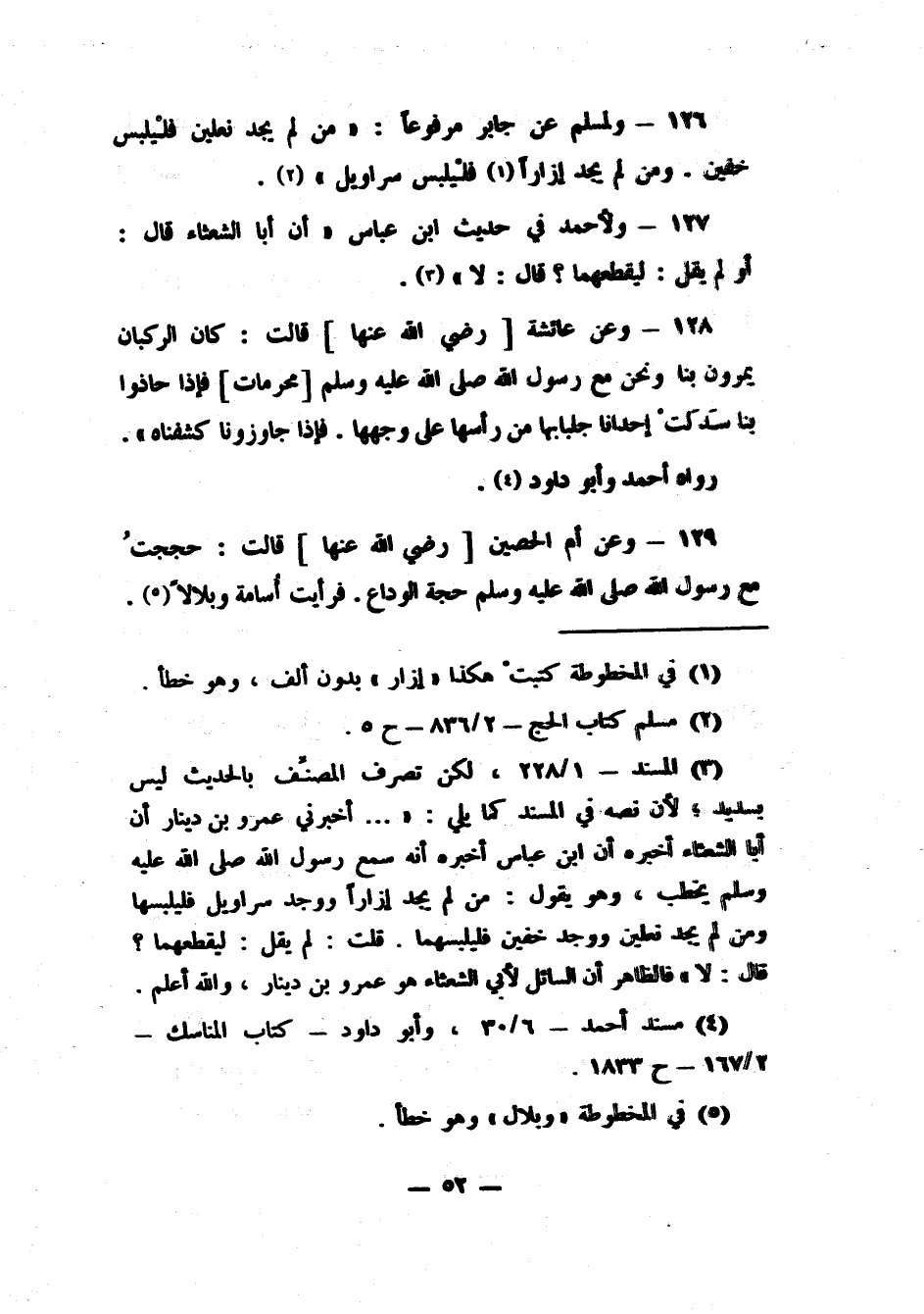 126- ولمسلم عن جابر مرفوعاً: "من لم يجد نعلين فَلْيَلْبَس خفين. ومن لم يجد إزاراً 1 فلْيلبس سراويل" 2.