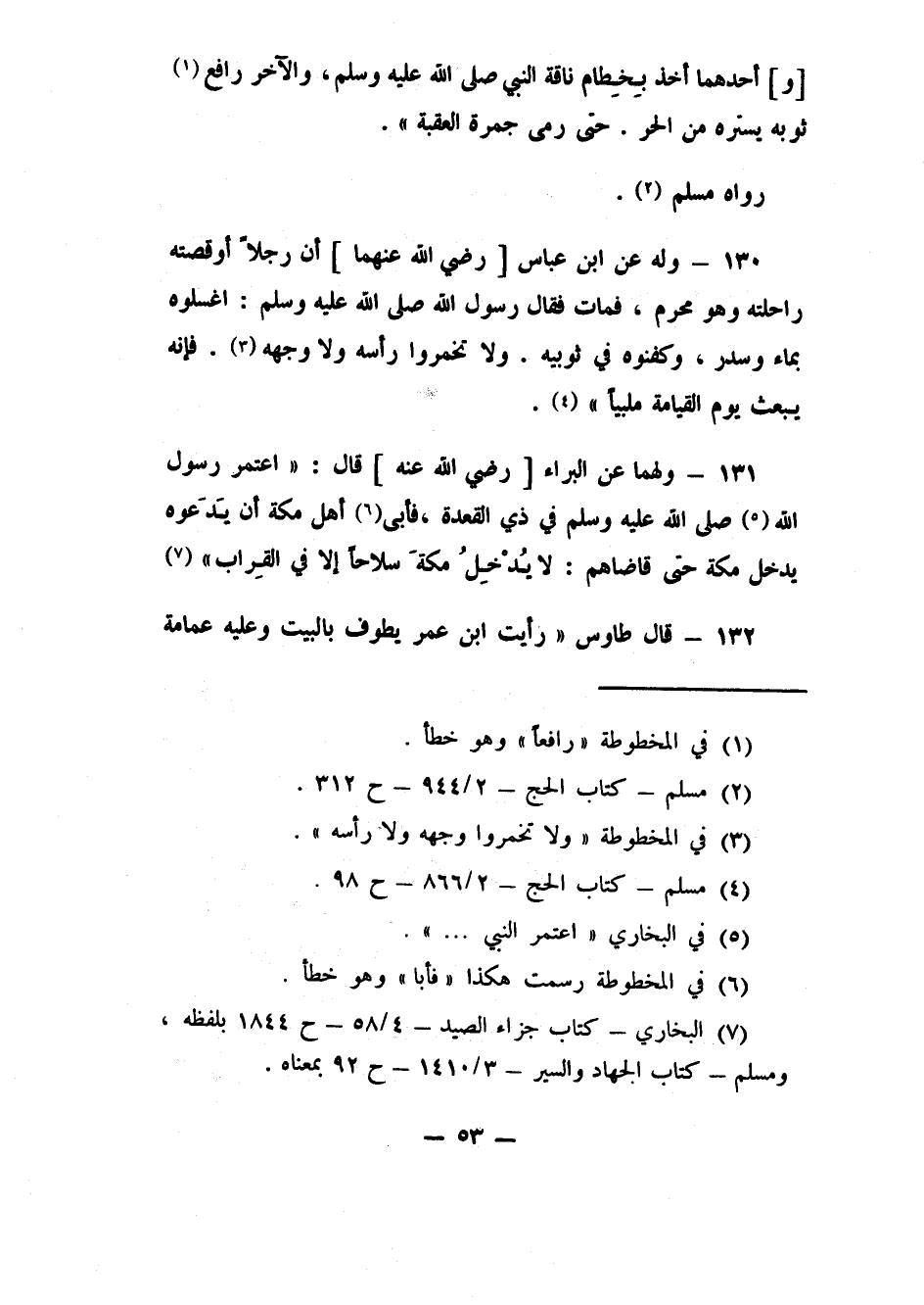 130- وله عن ابن عباس] رضي الله عنهما] : "أن رجلاً أوقصته راحلته وهو محرم، فمات، فقال رسول الله صلى الله عليه وسلم: اغسلوه بماء وسدر، وكفنوه في ثوبيه، ولا تخمروا رأسه ولا وجهه 3. فإنه يبعث يوم القيامة ملبياً "4.