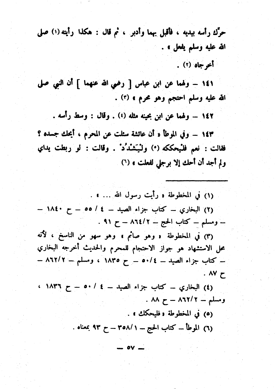 143- وفي الموطأ: "أن عائشة سئلت عن المحرم، أيحك جسده؟ فقالت: نعم فليَحْكُكْه5 وَلْيَشْدُدْ. وقالت: لو ربطت يداي ولم أجد أن أحك إلا برجلي لفعلت"6