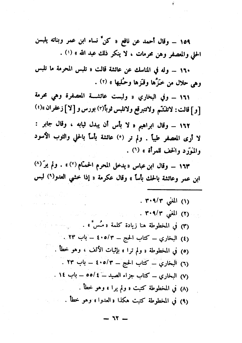 159- وقال أحمد عن نافع: "كُنَّ نساء ابن عمر وبناته يلبسن الحلي والمعصفر، وهن محرمات" لا ينكر ذلك عبد الله1.