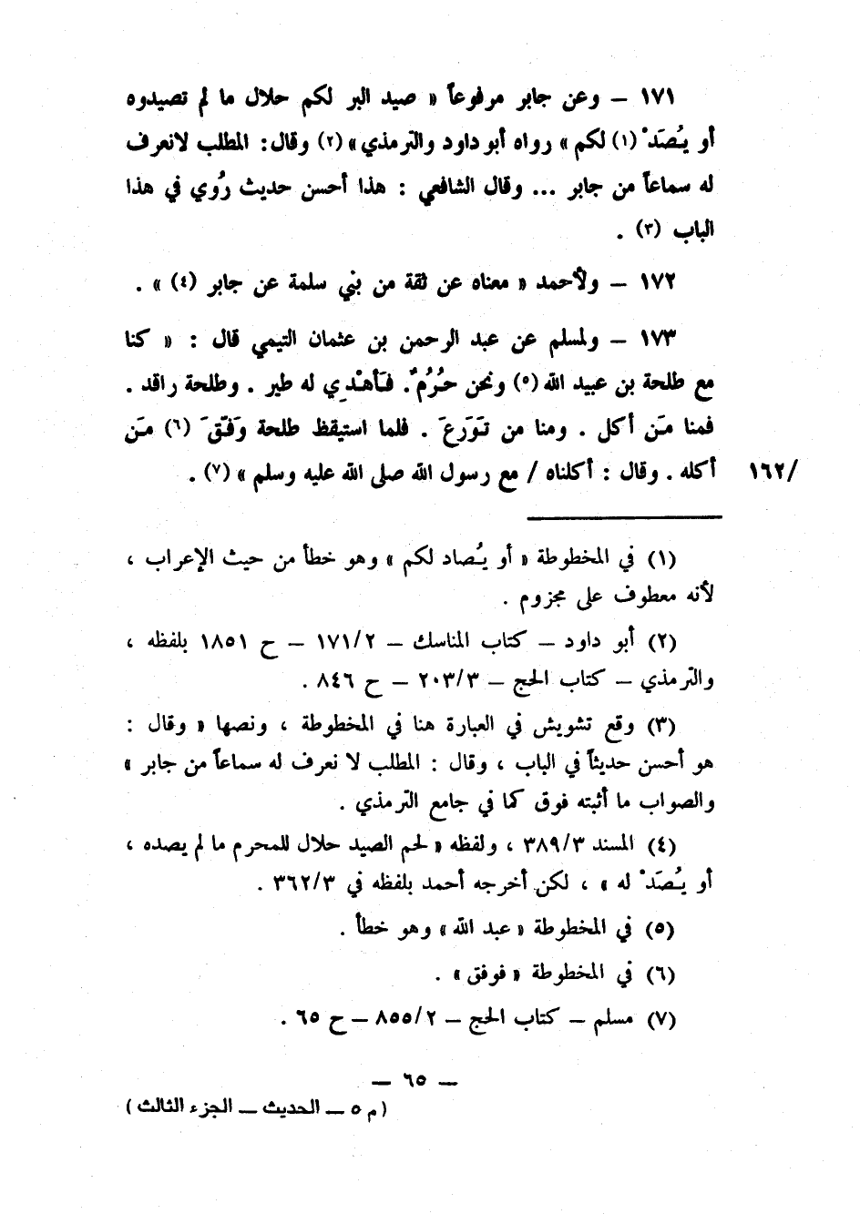 171- وعن جابر مرفوعاً: "صيد البر لكم حلال ما لم تصيدوه أو يُصَدْ 1 لكم" رواه أبو داود والترمذي2 وقال: المطلب لا نعرف له سماعاً من جابر ... وقال الشافعي: هذا أحسن حديث روي في هذا الباب3.