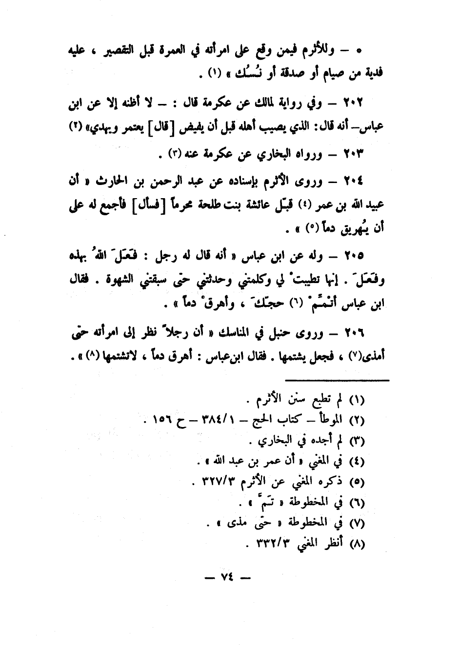 205- وله عن ابن عباس "أنه قال له رجل: فَعَلَ اللهُ بهذه وَفَعَلَ. إنها تطيبتْ لي وكلمتني وحدثتني حتى سبقَتْنِي الشهوة. فقال ابن عباس أتْمِمْ6 حجّكَ، وأهرقْ دماً".