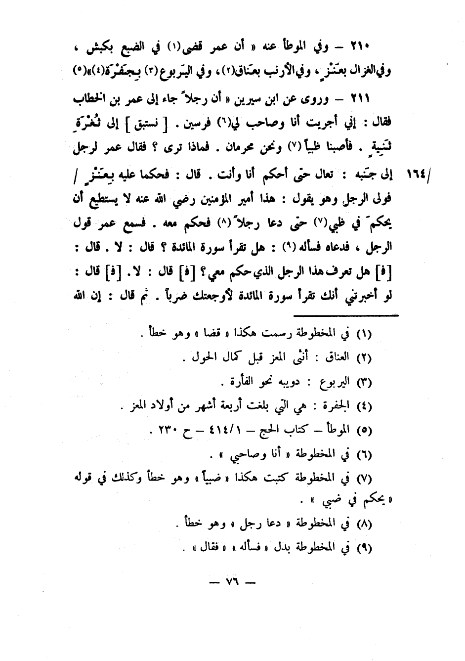 211- وروى عن ابن سيرين: "أن رجلاً جاء إلى عمر بن الخطاب فقال: إني أجريت أنا وصاحب لي6 فرسين [نستبق] إلى ثُغْرَةِ ثَنِيّة. فأصبنا ظبياً7 ونحن محرمان. فماذا ترى؟ فقال عمر لرجل إلى جَنبه: تعال حتى أحكم أنا وأنت. قال: فحكما عليه بعنْز فولى الرجل وهو يقول: هذا أمير المؤمنين رضي الله عنه لا يستطيع أن يحكمَ في ظبي حتى دعا رجلاً8 فحكم معه. فسمع عمر قول الرجل، فدعاه فسأله9: هل تقرأ سورة المائدة؟ قال: لا. قال: [فـ] هل تعرف هذا الرجل الذي حكم معي؟ [فـ] قال: لا. [فـ] قال: لو أخبرتني أنك تقرأ سورة المائدة لأوجعتك ضرباً. ثم قال: إن الله
