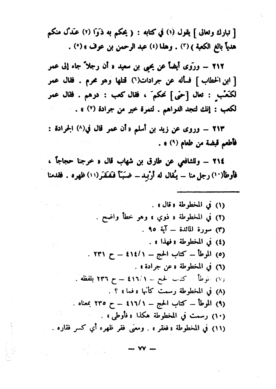 212- ورَوى أيضاً عن يحيى بن سعيد: (أن رجلاً جاء إلى عمر [ابن الخطاب] فسأله عن جرادات6 قتلها وهو محرم. فقال عمر لكَعْبٍ: تعال [حتى] نحكمَ، فقال كعب: درهم. فقال عمر لكعب: إنك لتجد الدراهم. لتمرة خير من جرادة) 7.