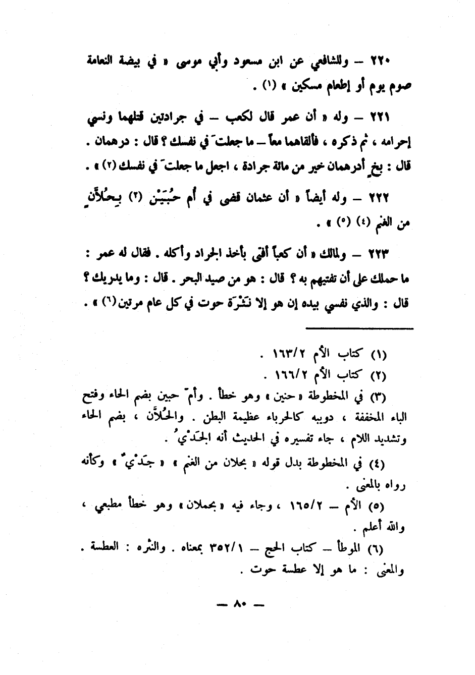 221- وله: "أن عمرقال لكعب- في جرادتين قتلهما ونسي إحرامه ثم ذكره، فألقاهما معاً - ما جعلتَ في نفسك؟ قال: درهمان. قال: بخ أدرهمان خير من مائة جرادة، اجعل ما جعلتَ في نفسك2") .