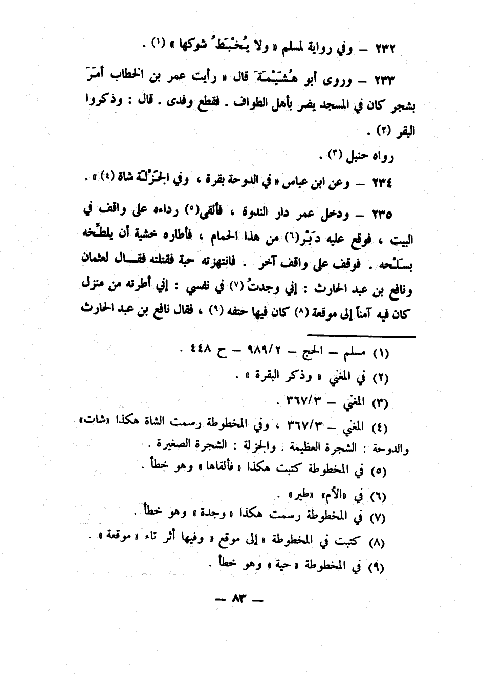 233- وروى أبو هُشَيْمَة قال: (رأيت عمر بن الحطاب أمَرَ بشجر كان في المسجد يضر بأهل الطواف، فقطع وفدى. قال: وذكروا البقر) 2. رواه حنبل3.