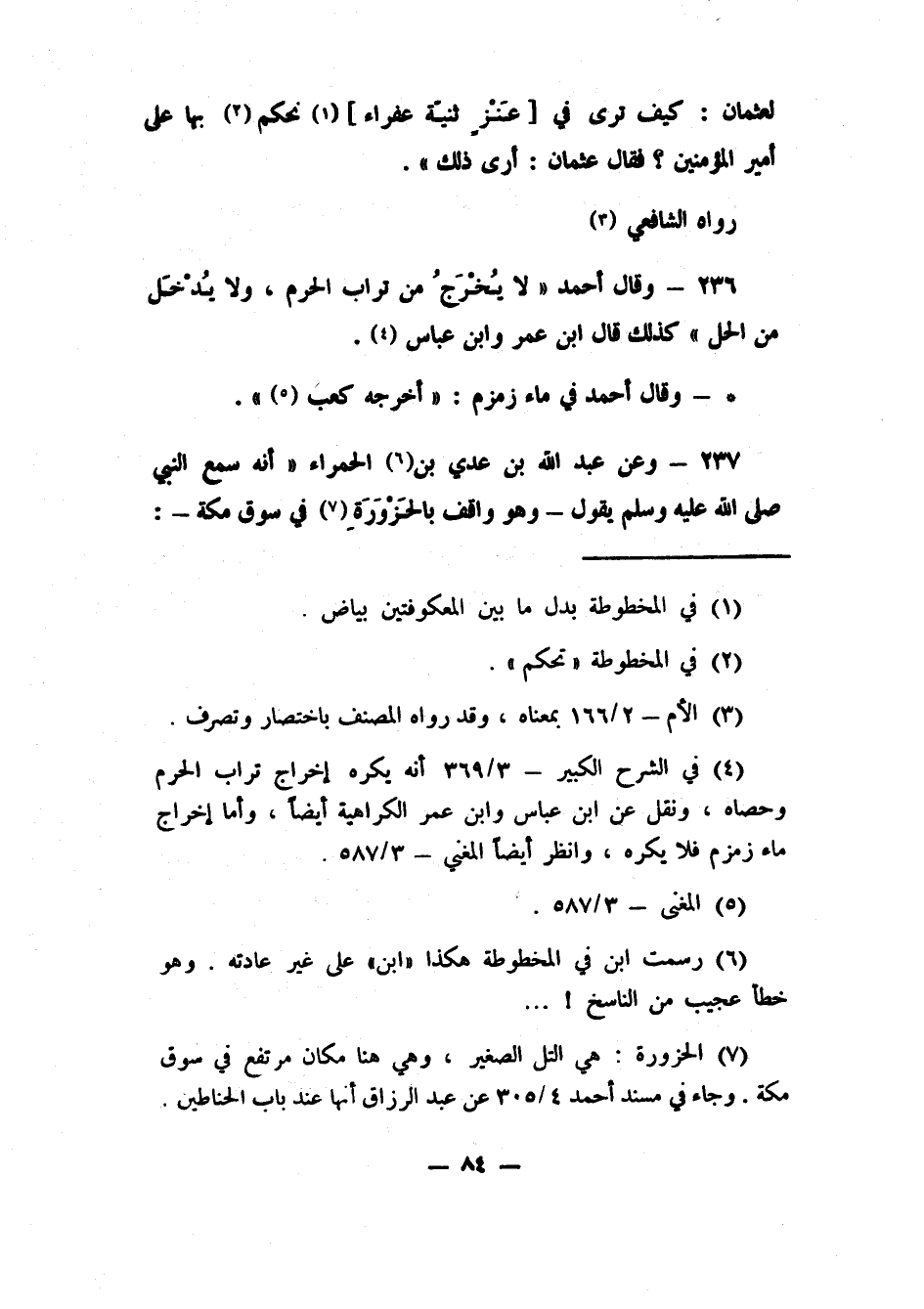 236- وقال أحمد: (لا يُخْرَجُ من تراب الحرم، ولا يُدْخَلُ من الحل. كذلك قال ابن عمر وابن عباس) 4 - وقال أحمد في ماء زمزم: (أخرجه كعب) 5.