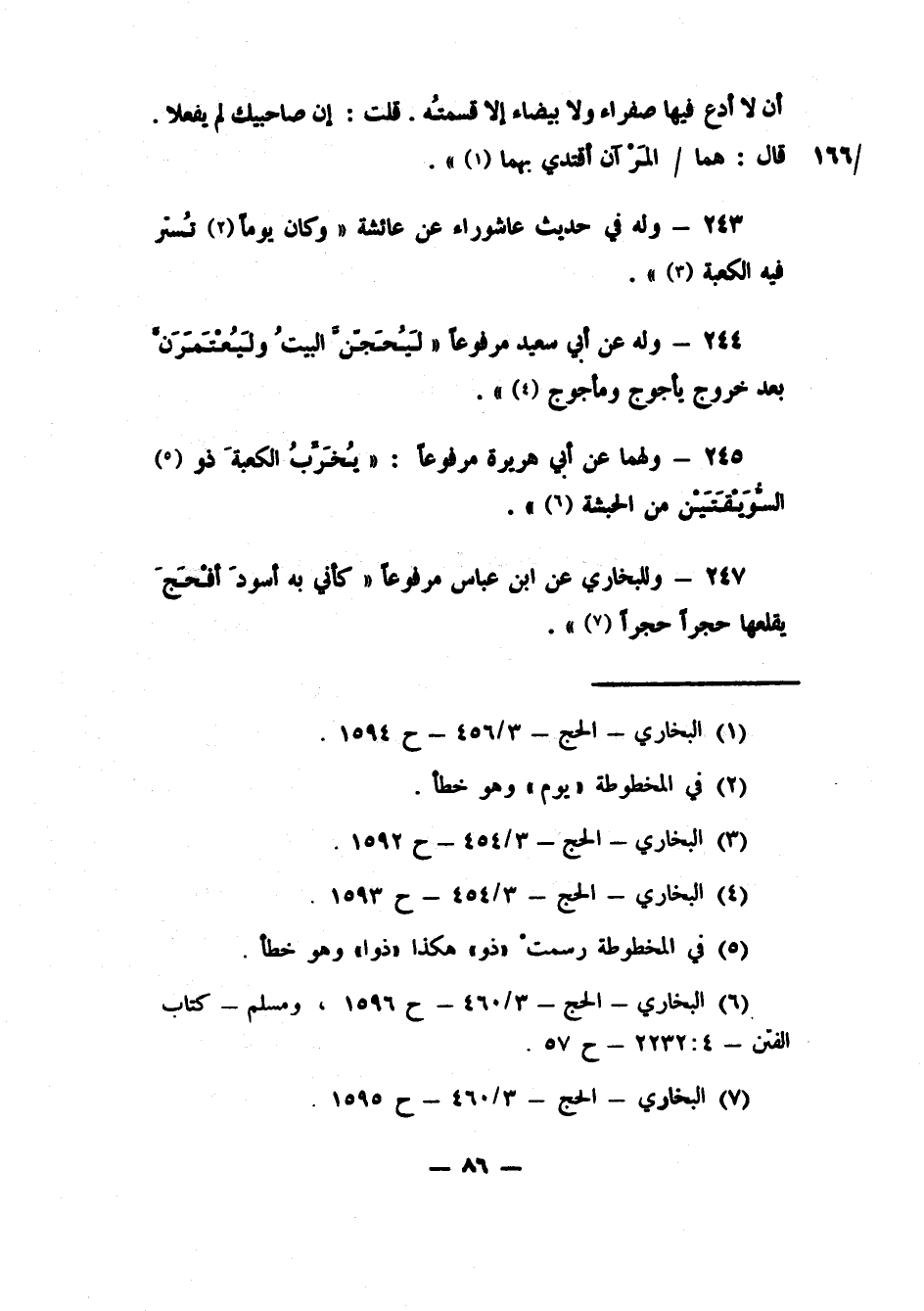 246- وللبخاري عن ابن عباس مرفوعاً "كأني به أسودَ أفْحَج يقلعها حجرا حجرا" 7.