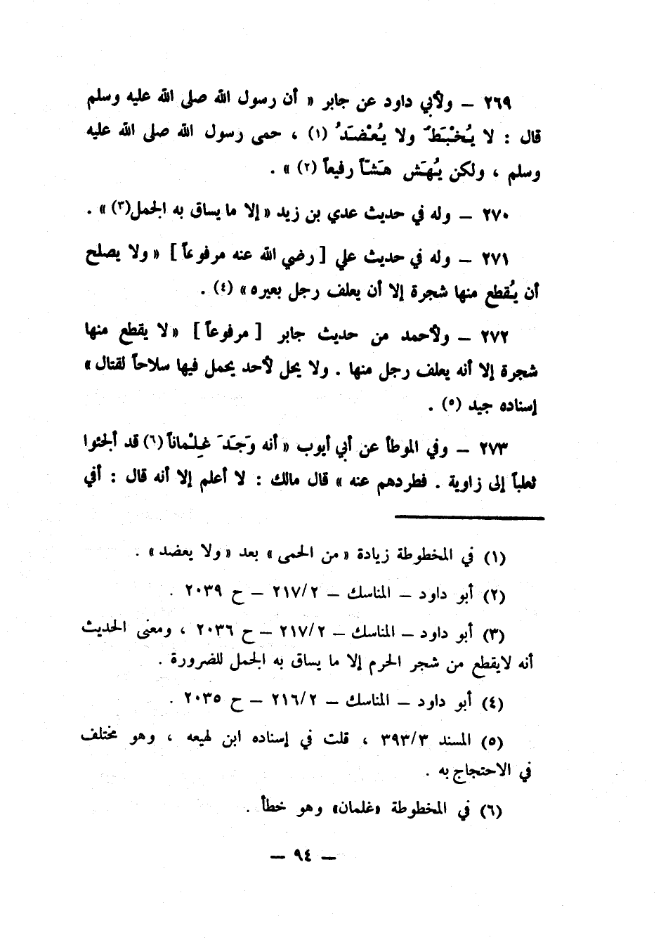 269- ولأبي داود عن جابر أن رسول الله صلى الله عليه وسلم قال: "لا يُخْبَطُ ولا يُعْضَد، 1 حمى رسول الله صلى الله عليه وسلم ولكن يُهَشّ هشّاً رفيعاً" 2.