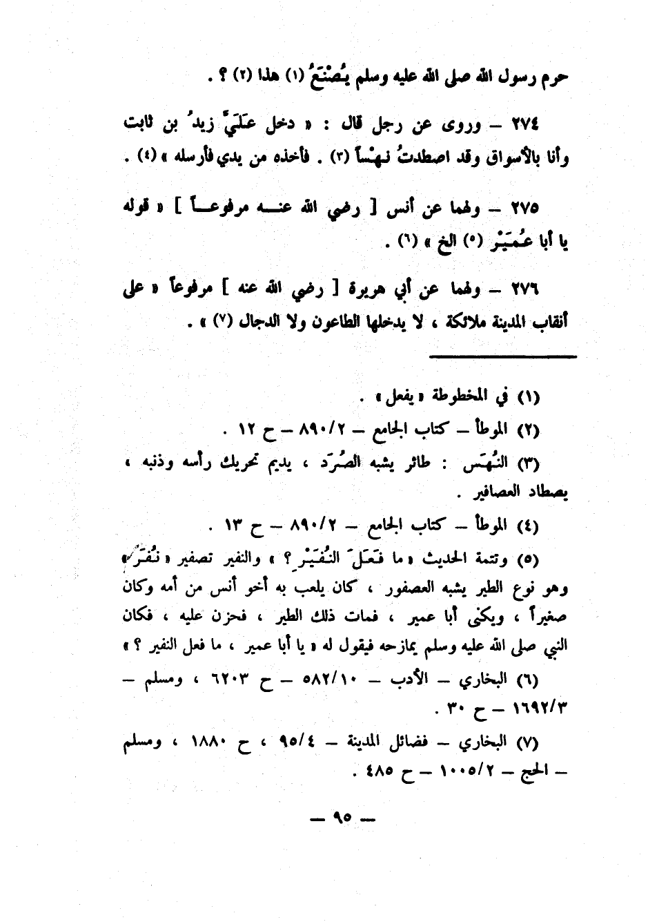 5 وتتمة الحديث "ما فعل النغير؟ " والنغير تصغير "نغر"، وهو نوع الطير يشبه العصفور, كان يلعب به أخو أنس من أمه وكان صغيرا, ويكنى أبا عمير, فمات ذلك الطير, فحزن عليه, فكان النبي صلى الله عليه وسلم يمازحه فيقول له: "يا أبا عمير, ما فعل النغير؟ ".