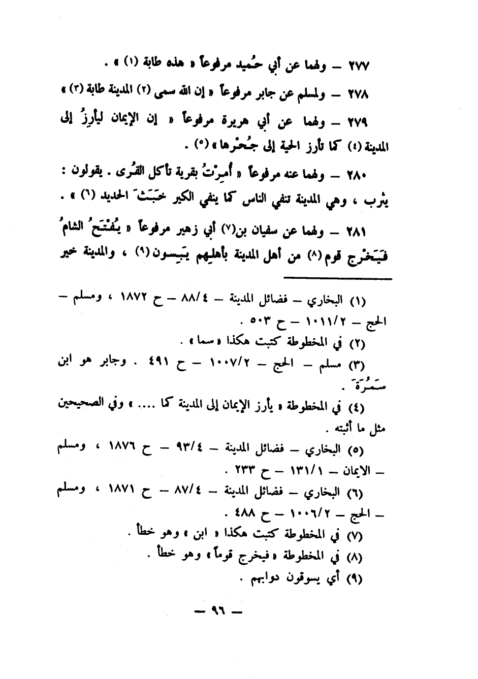 280- ولهما عنه مرفوعاً: "أُمِرْتُ بقرية تأكل القُرى. يقولون: يثرب، وهي المدينة تنفي الناس كما ينفي الكير خَبَثَ الحديد" 6.