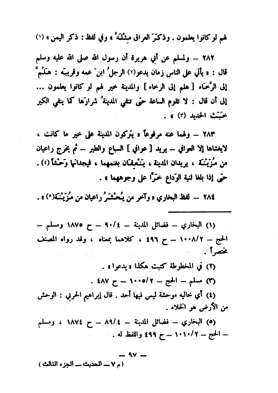 283- ولهما عنه مرفوعاً: "يتركون المدينة على خير ما كانت، لا يغشاها إلا العوافي - يريد [عوافي] السباع والطير - ثم يخرج راعيان من مُزَيْنَة، يريدان المدينة، يَنْعِقَان بغنمهما، فيجدانها وَحْشاً.4 حتى إذا بلغا ثنية الوَداع خَرّاً على وجوههما".