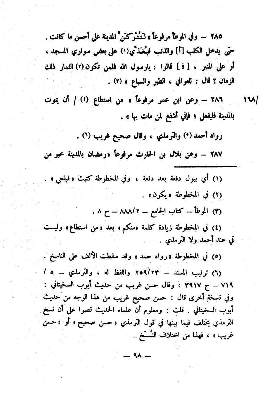 286- وعن ابن عمر مرفوعاً: "من استطاع 4 أن يموت بالمدينة فليفعل ; فإني أشفع لمن مات بها" رواه أحمد5 والترمذي، وقال صحيح غريب 6.