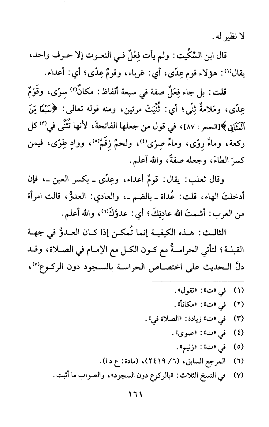 قلت: بل جاء فِعَلٌ صفة في سبعة ألفاظ: مكانٌ (¬2) سِوًى، وقَوْمٌ عِدًى، ومَلامةٌ ثِنًى؛ أي: وثُنِّيَتْ مرتين، ومنه قوله تعالى: {سَبْعًا مِنَ الْمَثَانِي} [الحجر: 87]، في قول من جعلها الفاتحةَ، لأنها تُثَنَّى في (¬3) كل ركعة، وماءٌ رِوًى، وماءٌ صِرًى (¬4)، ولحمٌ زِقَمٌ (¬5)، ووادٍ طِوًى، فيمن كسرَ الطاءَ، وجعله صفةً، واللَّه أعلم.