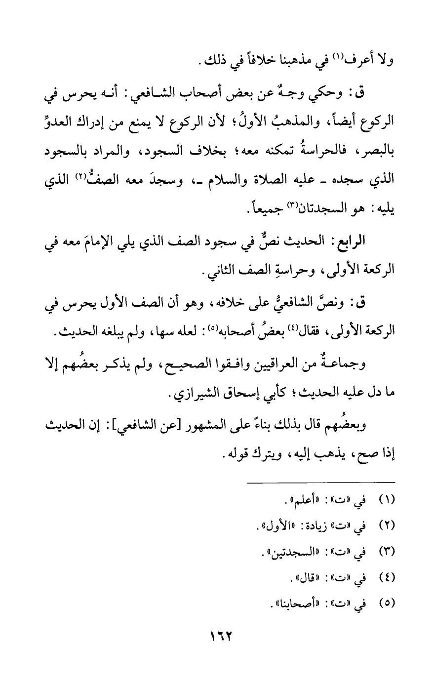 ق: ونصَّ الشافعيُّ على خلافه، وهو أن الصف الأول يحرس في الركعة الأولى، فقال (¬4) بعضُ أصحابه (¬5): لعله سها، ولم يبلغه الحديث.
