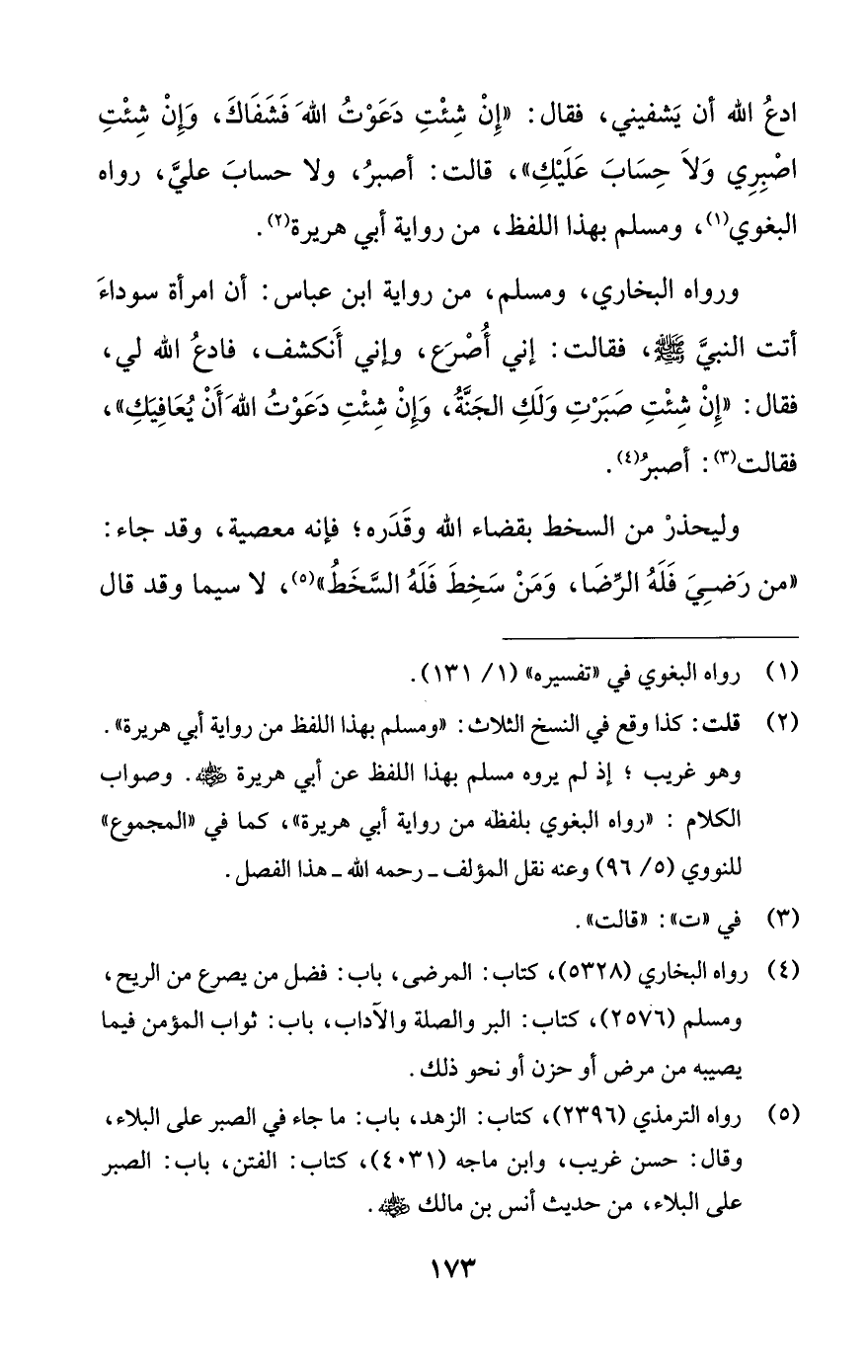 ورواه البخاري، ومسلم، من رواية ابن عباس: أن امرأة سوداءَ أتت النبيَّ -صلى اللَّه عليه وسلم-، فقالت: إني أُصرعَ، وإني أَنكشف، فادعُ اللَّه لي، فقال: "إِنْ شِئْتِ صَبَرْتِ وَلَكِ الجَنَّةُ، وَإِنْ شِئْتِ دَعَوْتُ اللَّه أَنْ يُعَافِيَكِ"، فقالت (¬3): أصبرُ (¬4).