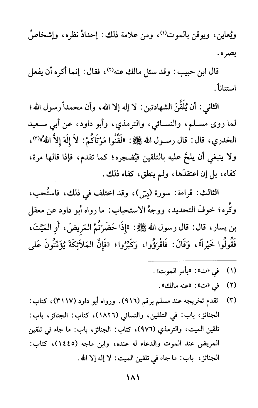 الثاني: أن يُلَقَّنَ الشهادتين: لا إله إلا اللَّه، وأن محمدًا رسول اللَّه؛ لما روى مسلم، والنسائي، والترمذي، وأبو داود، عن أبي سعيد الخدري، قال: قال رسول اللَّه -صلى اللَّه عليه وسلم-: "لَقِّنُوا مَوْتَاكُم: لَا إِلَهَ إِلَّا اللَّهُ" (¬3)، ولا ينبغي أن يلحَّ عليه بالتلقين فيُضجره؛ كما تقدم، فإذا قالها مرة، كفاه، بل إن اعتقدَها، ولم ينطق، كفاه ذلك.