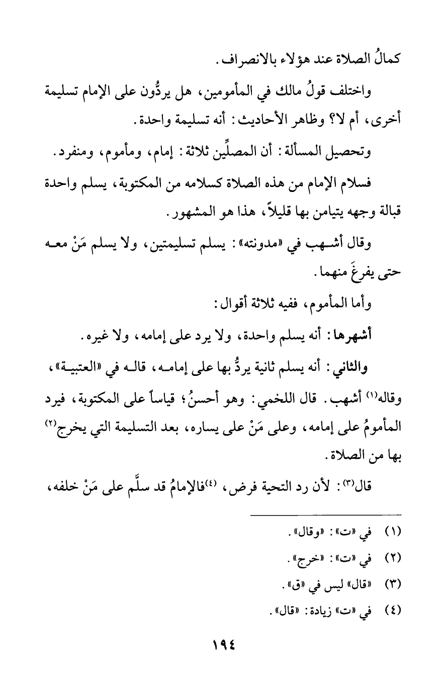 وقال أشهب في "مدونته": يسلم تسليمتين، ولا يسلم مَنْ معه حتى يفرغَ منهما.