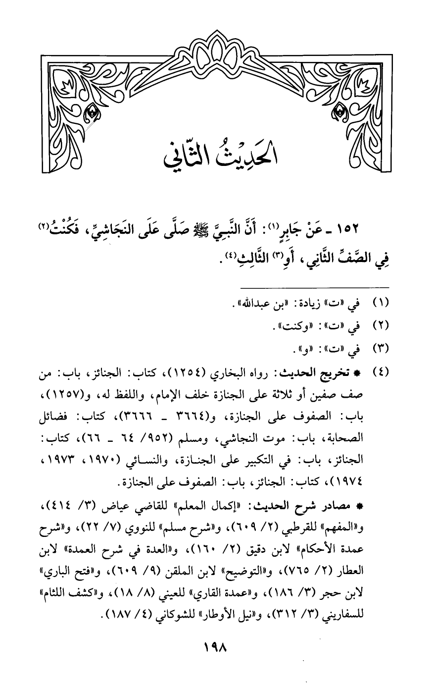 152 - عَنْ جَابِرٍ (¬1): أَنَّ النَّبِيَّ -صلى اللَّه عليه وسلم- صَلَّى عَلَى النَجَاشِيِّ، فَكُنْتُ (¬2) فِي الصَّفِّ الثَّانِي، أَوِ (¬3) الثَّالِثِ (¬4).