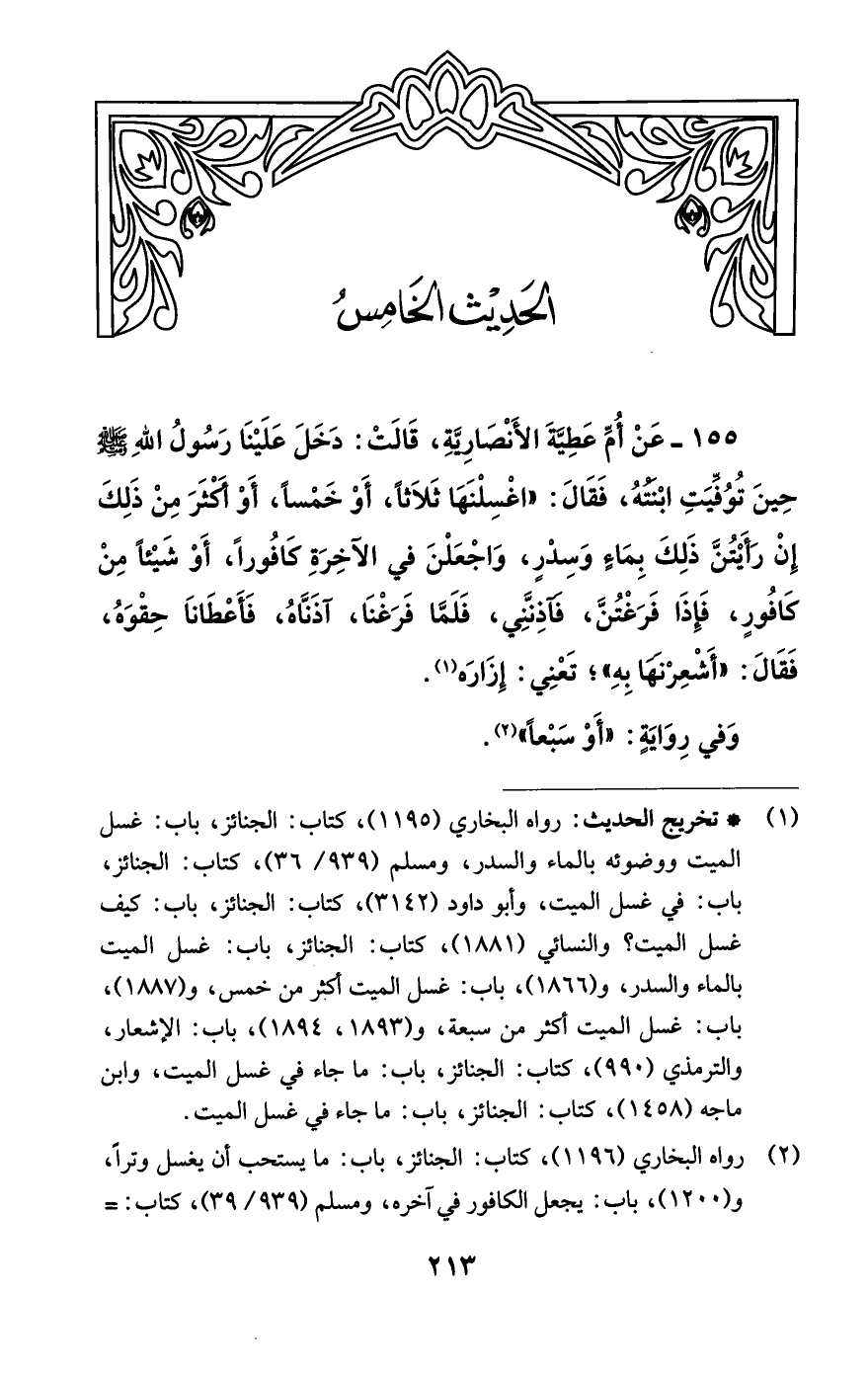 155 - عَنْ أُمِّ عَطِيَّةَ الأَنْصَارَّيةِ، قَالَتْ: دَخَلَ عَلَيْنَا رَسُولُ اللَّهِ -صلى اللَّه عليه وسلم- حِينَ تُوُفِّيَتِ ابْنَتُهُ، فَقَالَ: "اغْسِلْنَهَا ثَلَاثًا، أَوْ خَمْسًا، أَوْ أكثَرَ مِنْ ذَلِكَ إِنْ رَأَيْتُنَّ ذَلِكَ بِمَاءٍ وَسِدْرٍ، وَاجْعَلْنَ في الآخِرَةِ كَافُورًا، أَوْ شَيْئًا مِنْ كَافُورٍ، فَإِذَا فَرَغْتُنَّ، فآذِنَّنَي، فَلَمَّا فَرَغْنَا، آذَنَّاهُ، فَأَعْطَانَا حِقْوَهُ، فَقَالَ: "أَشْعِرْنهَا بِه"؛ تَعْنِي: إِزَارَه (¬1).