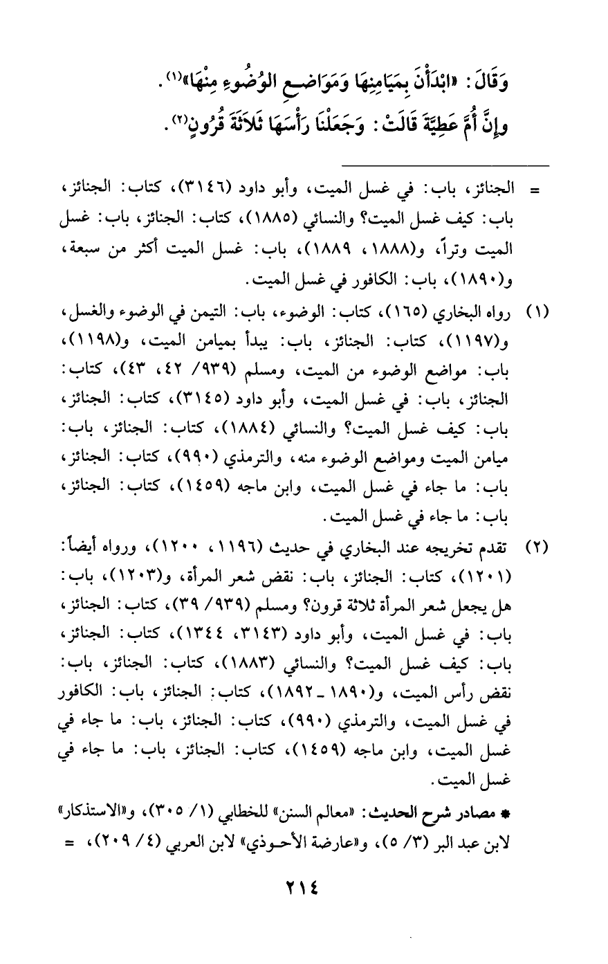 (¬1) رواه البخاري (165)، كتاب: الوضوء، باب: التيمن في الوضوء والغسل، و (1197)، كتاب: الجنائز، باب: يبدأ بميامن الميت، و (1198)، باب: مواضع الوضوء من الميت، ومسلم (939/ 42، 43)، كتاب: الجنائز، باب: في غسل الميت، وأبو داود (3145)، كتاب: الجنائز، باب: كيف غسل الميت؟ والنسائي (1884)، كتاب: الجنائز، باب: ميامن الميت ومواضع الوضوء منه، والترمذي (990)، كتاب: الجنائز، باب: ما جاء في غسل الميت، وابن ماجه (1459)، كتاب: الجنائز، باب: ما جاء في غسل الميت.
