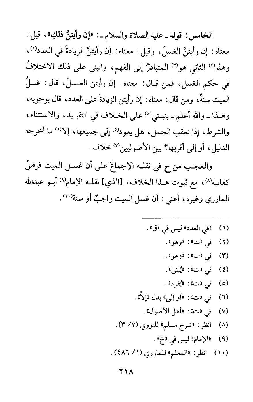 الخامس: قوله -عليه الصلاة والسلام-: "إن رأيتنَّ ذلكِ"، قيل: معناه: إن رأيتنَّ الغسلَ، وقيل: معناه: إن رأيتنَّ الزيادةَ في العدد (¬1)، وهذا (¬2) الثاني هو (¬3) المتبادَرُ إلى الفهم، وانبنى على ذلك الاختلافُ في حكم الغسل، فمن قال: معناه: إن رأيتن الغسلَ، قال: غسلُ الميت سنةٌ، ومن قال: معناه: إن رأيتن الزيادةَ على العدد، قال بوجوبه، وهذا -واللَّه أعلم- ينبني (¬4) على الخلاف في التقييد، والاستثناء، والشرط، إذا تعقب الجمل، هل يعود (¬5) إلى جميعها، إلا (¬6) ما أخرجه الدليل، أو إلى أقربها؟ بين الأصوليين (¬7) خلاف.