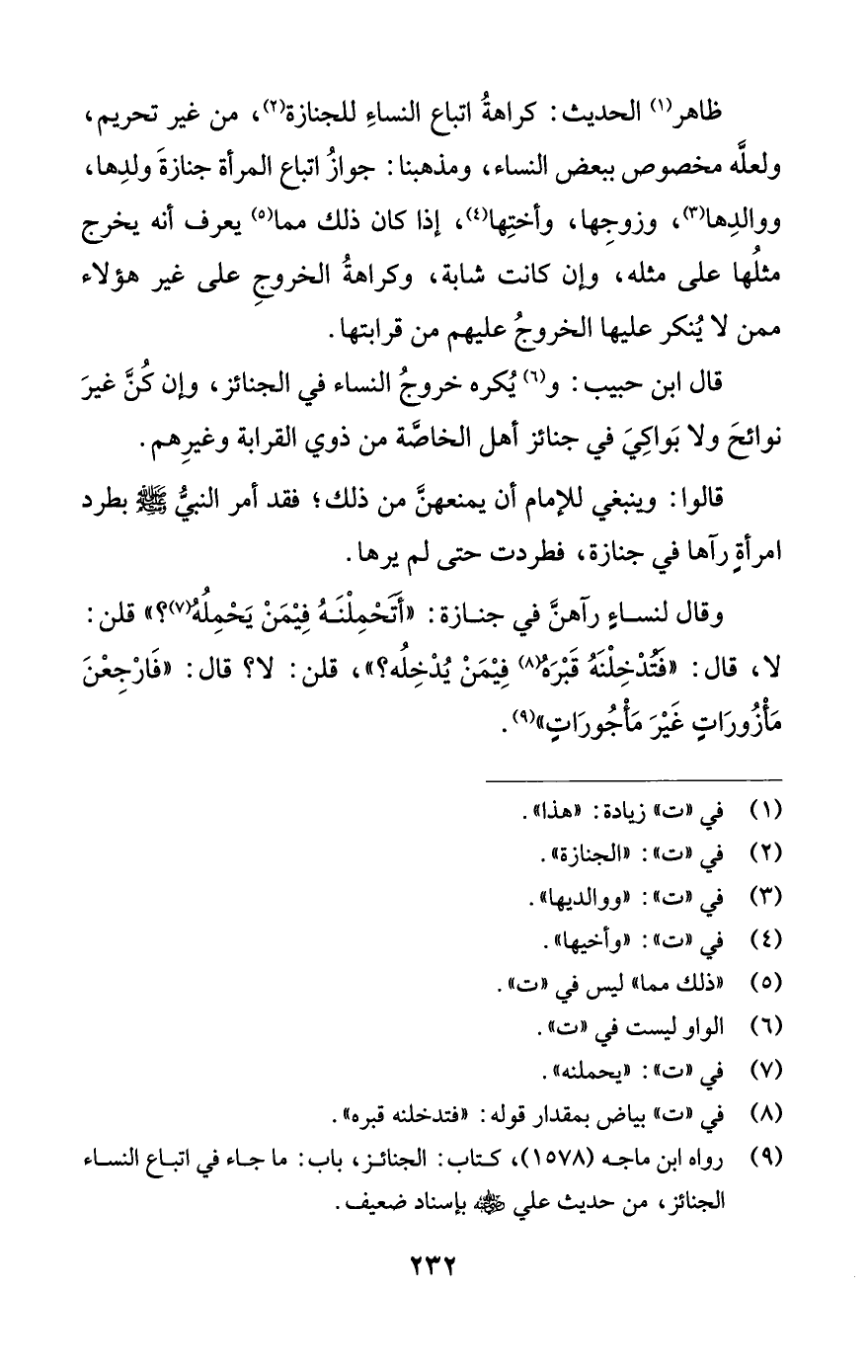 (¬9) رواه ابن ماجه (1578)، كتاب: الجنائز، باب: ما جاء في اتباع النساء الجنائز، من حديث علي -رضي اللَّه عنه- بإسناد ضعيف.