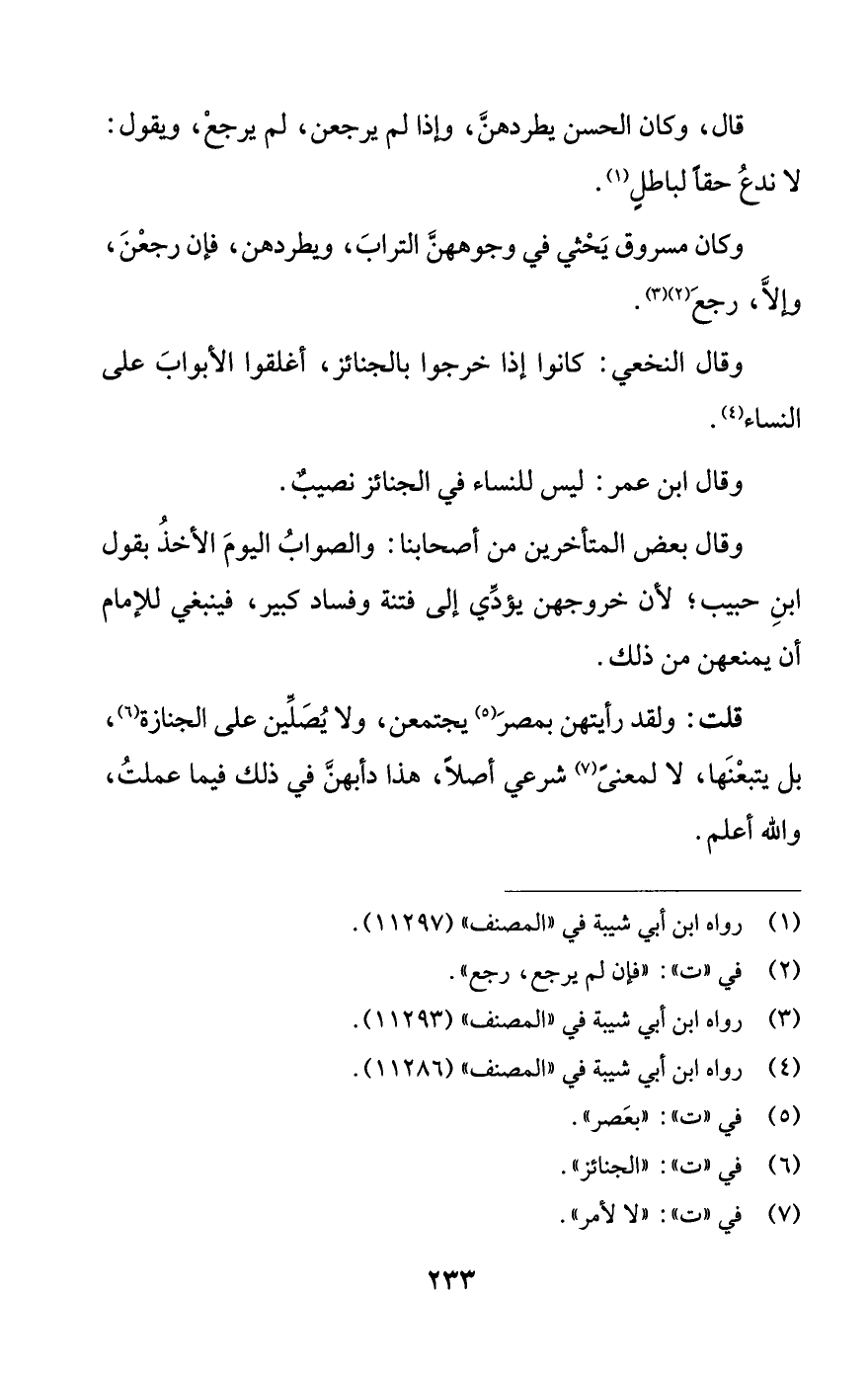 وقال النخعي: كانوا إذا خرجوا بالجنائز، أغلقوا الأبوابَ على النساء (¬4).