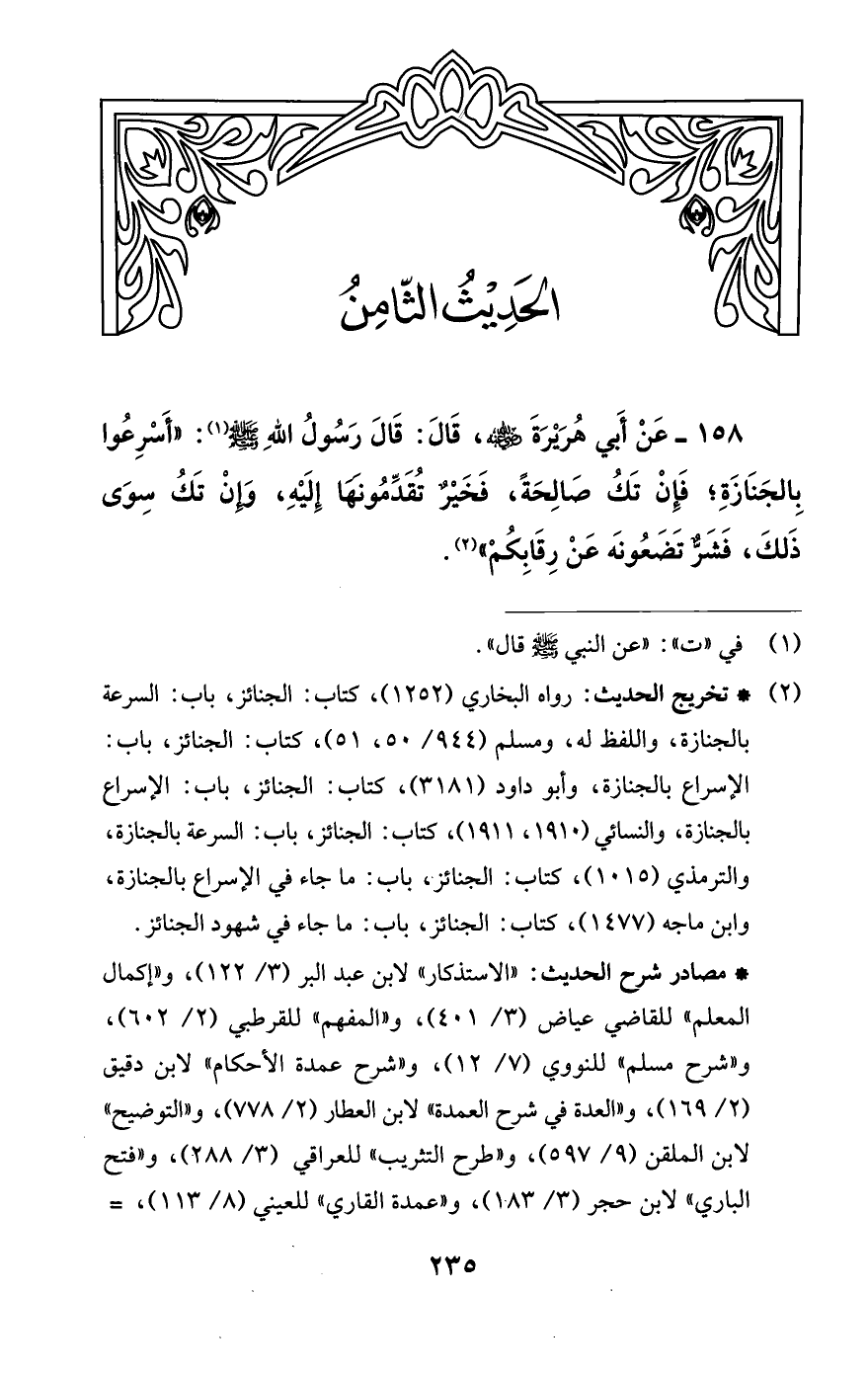 158 - عَنْ أَبي هُرَيْرَةَ -رضي اللَّه عنه-، قَالَ: قَالَ رَسُولُ اللَّهِ -صلى اللَّه عليه وسلم- (¬1): "أَسْرِعُوا بِالجَنَازَةِ؛ فَإِنْ تَكُ صَالِحَةً، فَخَيْرٌ تُقَدِّمُونها إِلَيْهِ، وَإِنْ تَكُ سِوَى ذَلكَ، فَشَرٌّ تَضَعُونَه عَنْ رِقَابِكُم" (¬2).