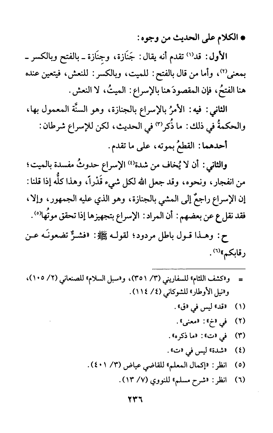 والثاني: أن لا يُخاف من شدة (¬4) الإسراع حدوثُ مفسدة بالميت؛ من انفجار، ونحوه، وقد جعل اللَّه لكل شيء قَدْرًا، وهذا كلُّه إذا قلنا: إن الإسراع راجعٌ إلى المشي بالجنازة، وهو الذي عليه الجمهور، وإلا، فقد نقل ع عن بعضهم: أن المراد: الإسراع بتجهيزها إذا تحقق موتُها (¬5).