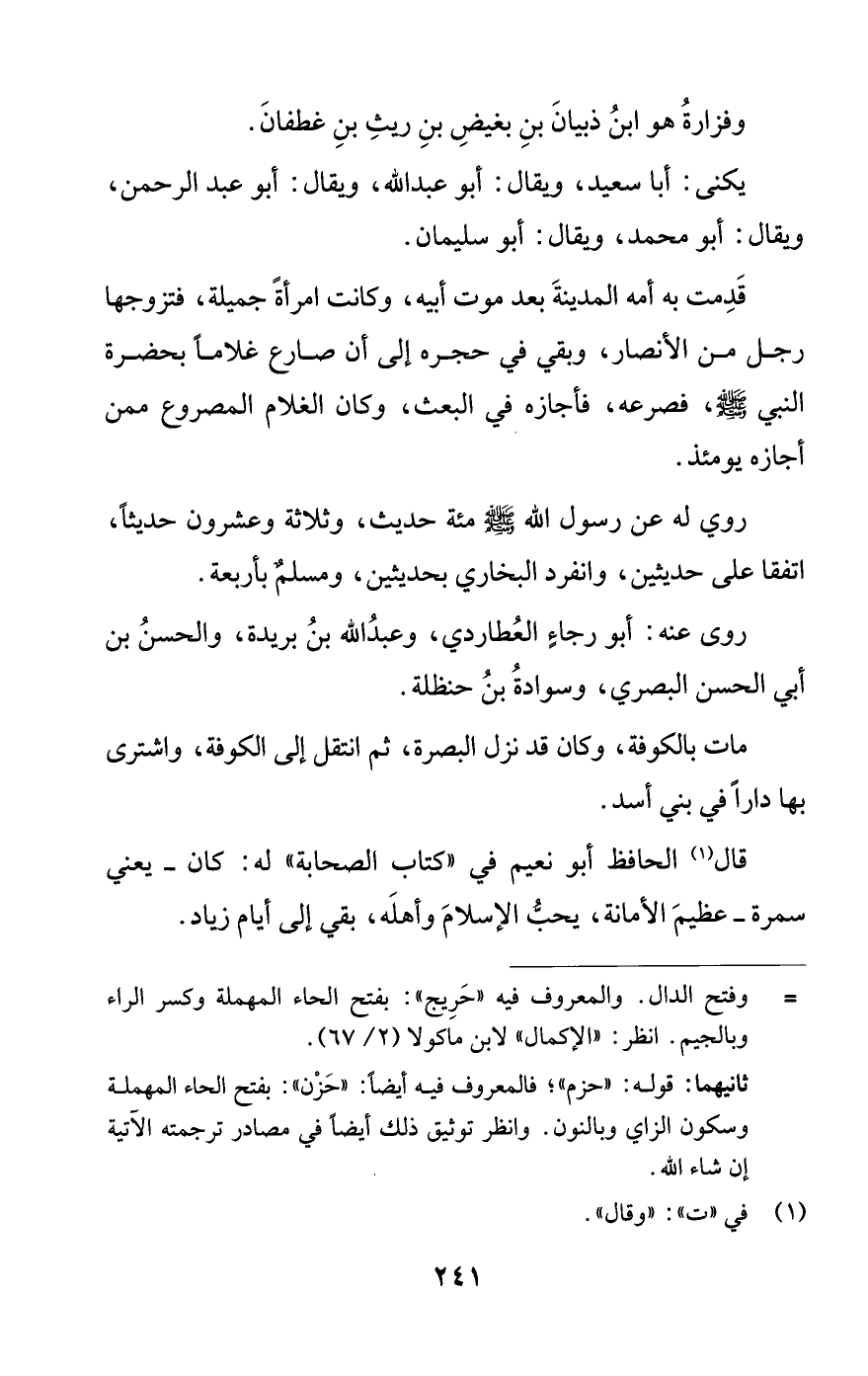 ثانيهما: قوله: "حزم"؛ فالمعروف فيه أيضًا: "حَزْن": بفتح الحاء المهملة وسكون الزاي وبالنون. وانظر توثيق ذلك أيضًا في مصادر ترجمته الآتية إن شاء اللَّه.