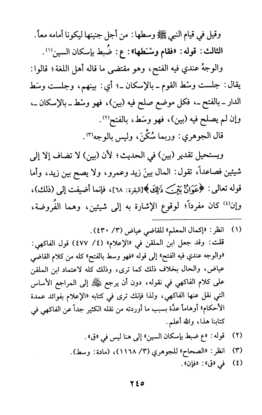 قلت: وقد جعل ابن الملقن في "الإعلام" (4/ 477) قول الفاكهي: "والوجه عندي فيه الفتح" إلى قوله "فهو وسط بالفتح" كله من كلام القاضي عياض، والحال بخلاف ذلك كما ترى، وذلك كله لاعتماد ابن الملقن على كلام الفاكهي في نقوله، دون أن يرجع رحمه اللَّه إلى المراجع الأساس التي نقل عنها الفاكهي، ولذا فإنك ترى في كتابه "الإعلام بفوائد عمدة الأحكام" أوهاما عدَّة بسبب ما أوردته من نقله الكثير جدًا عن الفاكهي في كتابنا هذا، واللَّه أعلم.