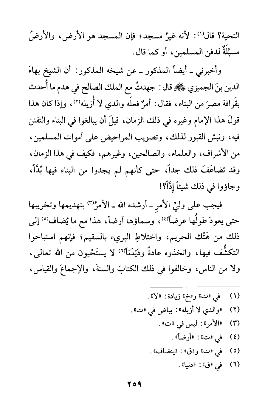 وأخبرني -أيضا المذكور- عن شيخه المذكور: أن الشيخ بهاءَ الدين بنَ الجميزي رحمه اللَّه تعالى قال: جهدتُ مع الملك الصالح في هدم ما أُحدث بقَرافة مصرَ من البناء، فقال: أمرٌ فعلَه والدي لا أُزيله (¬2)، وإذا كان هذا قولَ هذا الإِمام وغيره في ذلك الزمان، قبلَ أن يبالغوا في البناء والتفنن فيه، ونبش القبور لذلك، وتصويب المراحيض على أموات المسلمين، من الأشراف، والعلماء، والصالحين، وغيرهم، فكيف في هذا الزمان، وقد تضاعَفَ ذلك جدًا، حتى كأنهم لم يجدوا من البناء فيها بُدًّا، وجاؤوا في ذلك شيئًا إِدًّا؟!