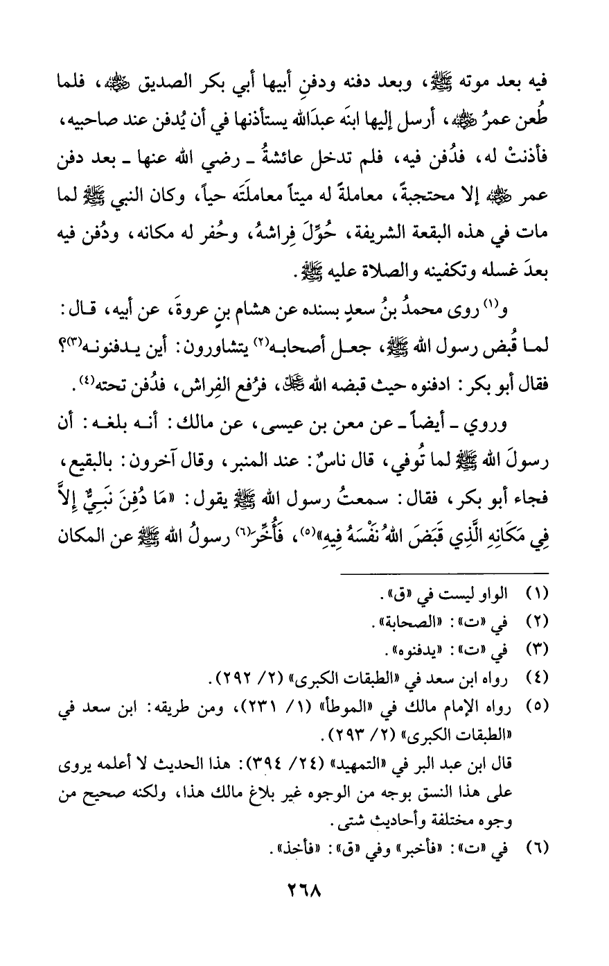 وروي -أيضًا- عن معن بن عيسى، عن مالك: أنه بلغه: أن رسولَ اللَّه-صلى اللَّه عليه وسلم- لما تُوفي، قال ناسٌ: عند المنبر، وقال آخرون: بالبقيع، فجاء أبو بكر، فقال: سمعتُ رسول اللَّه -صلى اللَّه عليه وسلم- يقول: "مَا دُفِنَ نبِيٌّ إِلَّا في مَكَانِهِ الَّذِي قَبَضَ اللَّهُ نَفْسَهُ فِيهِ" (¬5)، فَأُخِّرَ (¬6) رسولُ اللَّه -صلى اللَّه عليه وسلم- عن المكان