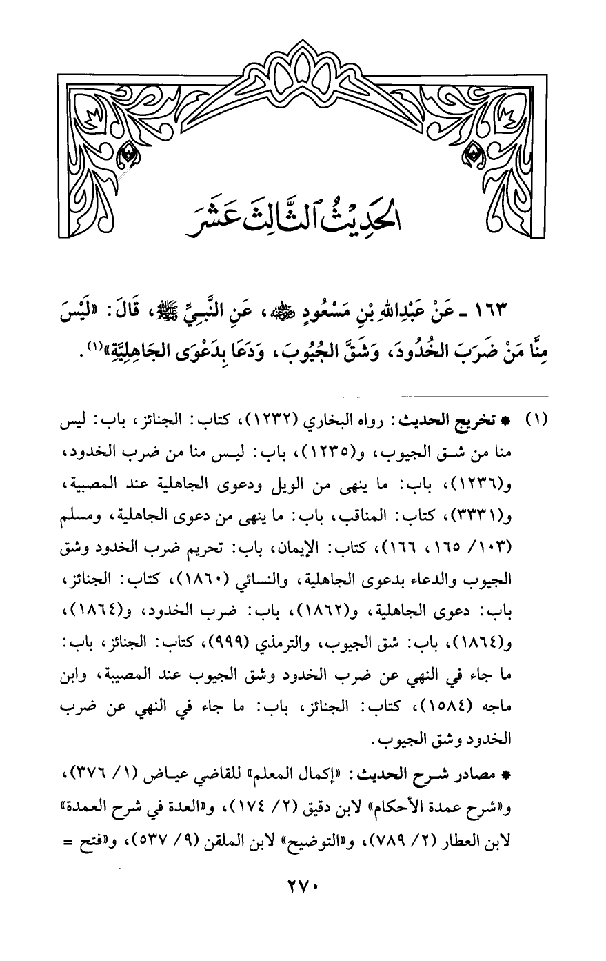 163 - عَنْ عَبْدِ اللَّهِ بْنِ مَسْعُودٍ -رضي اللَّه عنه-، عَنِ النَّبِيِّ -صلى اللَّه عليه وسلم-، قَالَ: "لَيْسَ مِنَّا مَنْ ضَرَبَ الخُدُودَ، وَشَقَّ الجُيُوبَ، وَدَعَا بِدَعْوَى الجَاهِلِيَّةِ" (¬1).
