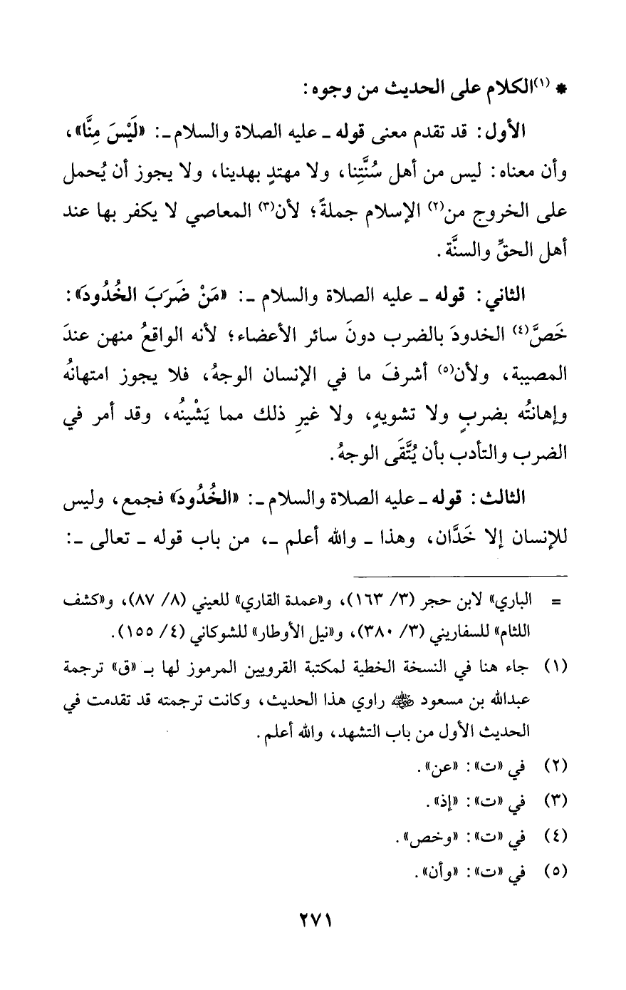 الثالث: قوله -عليه الصلاة والسلام-: "الخُدُودَ" فجمع، وليس للإنسان إلا خَدَّان، وهذا -واللَّه أعلم-، من باب قوله -تعالى-: