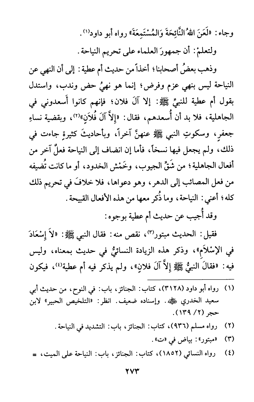 فقيل: الحديث مبتور (¬3)، نقص منه: فقال النبي -صلى اللَّه عليه وسلم-: "لَا إِسْعَادَ في الإِسْلَامِ"، وذكر هذه الزيادة النسائيُّ في حديث بمعناه، وليس فيه: "فقالَ النبيُّ -صلى اللَّه عليه وسلم- إِلَّا آلَ فلانٍ"، ولم يذكر فيه أم عطية (¬4)، فيكون